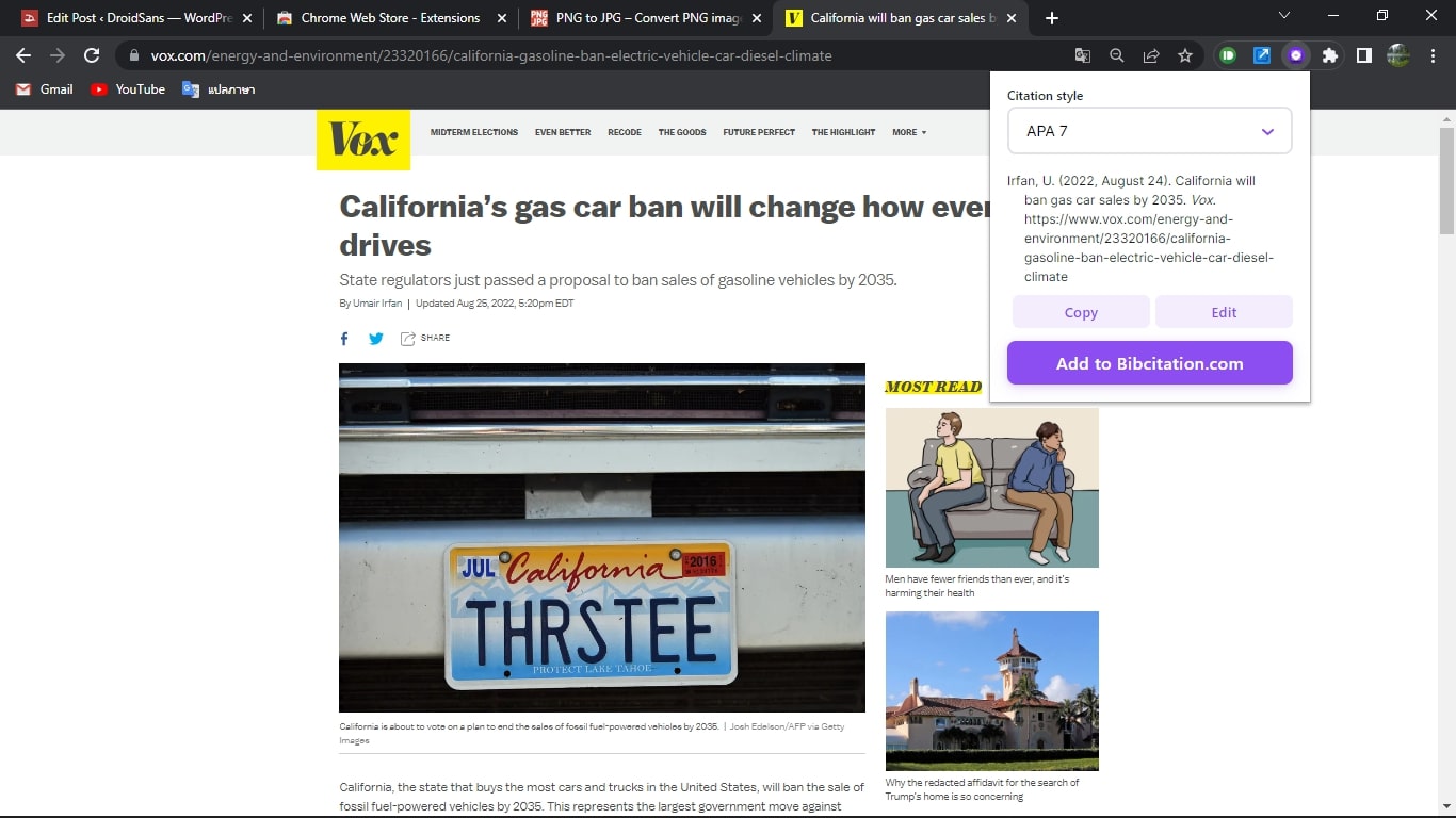 สำหรับวิชาไหนที่ต้องการให้เขียนอ้างอิงแบบจริงจัง ไม่ได้ใส่แค่ลิงก์แปะ ๆ ไป ก็คงต้องปวดหัวกับขั้นตอนการเขียนอ้างอิงกันแน่นอน ต้องมาคอยพิมพ์จุด พิมพ์เว้น ทำตัวเอียงต่าง ๆ ยิ่งใช้เวลานานเข้าไปใหญ่ จะดีกว่าไหมถ้าเรากดแค่ปุ่มเดียวแล้วขึ้นตัวอ้างอิงแบบถูกหลักมาให้เราเลย ซึ่งก็ทำได้ง่าย ๆ โดยกดปุ่ม Bibcitation ก็จะขึ้นการอ้างอิงเว็บไซต์ที่เรากำลังดูอยู่ได้เรียบร้อย แล้วถ้าต้องการอ้างอิงงานเขียน Journal วิชาการก็ทำได้เหมือนกัน โดยเลือกได้เลยว่าจะ Cite แบบไหน APA MLA และอื่น ๆ ก็แค่ไปกดเลือกประเภทที่ปุ่ม edit ได้ครับ