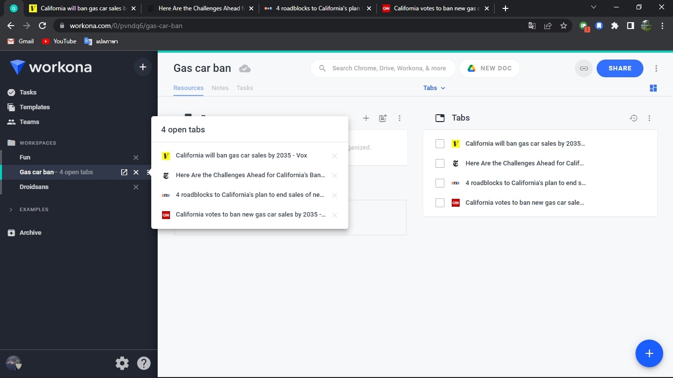 หลายคนเวลากำลังค้นหาข้อมูลก็มีเปิดแท็บทิ้งเอาไว้เป็นสิบ ๆ หน้า จนช่องให้กดด้านบนแต่ละอันเหลือขนาดเล็กเท่าไข่ปลา แล้วถ้าทำงานหลายวิชาก็ยิ่งมีแท็บจำนวนมากขึ้นไปอีก จะกดปิดก็เดี๋ยวลืมว่าเคยดูหน้าไหนไว้ แต่ละอันสำหรับวิชาอะไร ยิ่งถ้ามีหน้าไว้เปิดเฟซเปิดเพลงไว้ยิ่งรกกันไปใหญ่ ตัว Workona ก็จะมาตอบโจทย์ปัญหานี้ให้จัดการคนที่ชอบเปิดแท็บทิ้งไว้เยอะ ๆ โดยหลักการทำงานคือเราสามารถกดปุ่ม Extension เพื่อทำการเซฟแท็บใส่ไว้ใน Folder ตามหมวดหมู่ได้เลย ซึ่งก็ต่างจากการ Bookmark ธรรมดาเพราะตัวหน้าต่าง ๆ จะยังเปิดไว้อยู่ ไม่ได้เป็นปุ่มให้กดเปิดใหม่นั่นเอง (ยกเว้นว่าเราไม่ได้เปิดหน้านั้นนาน Browser ก็จะหยุดหน้านั้นไปตามปกติเพื่อรักษาพลังงาน) พอเราจะสลับชุดแท็บทำงานก็ไปกดในหน้า Workona ด้านซ้ายสุดเอาครับ