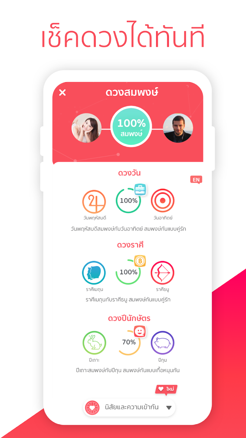 แอปหาคู่ ตัวนี้อาจถูกใจสายมูหลาย ๆ คน เพราะฟีเจอร์ในแอปเรียกได้ว่าเข้าใจในเรื่องของความเชื่อคนไทยเป็นอย่างดี มีระบบค้นหาคู่จากดวงสมพงศ์โดยอิงจากข้อมูลดวงราศีเกิด ดวงนักษัตรจีนตามปีเกิดที่ระบุไว้ เพื่อรวบรวมและคำนวณออกมาเป็นเปอร์เซ็นต์ให้ดูเลยว่าคนที่คุณสนใจมีดวงส่งเสริมกับเราหรือไม่