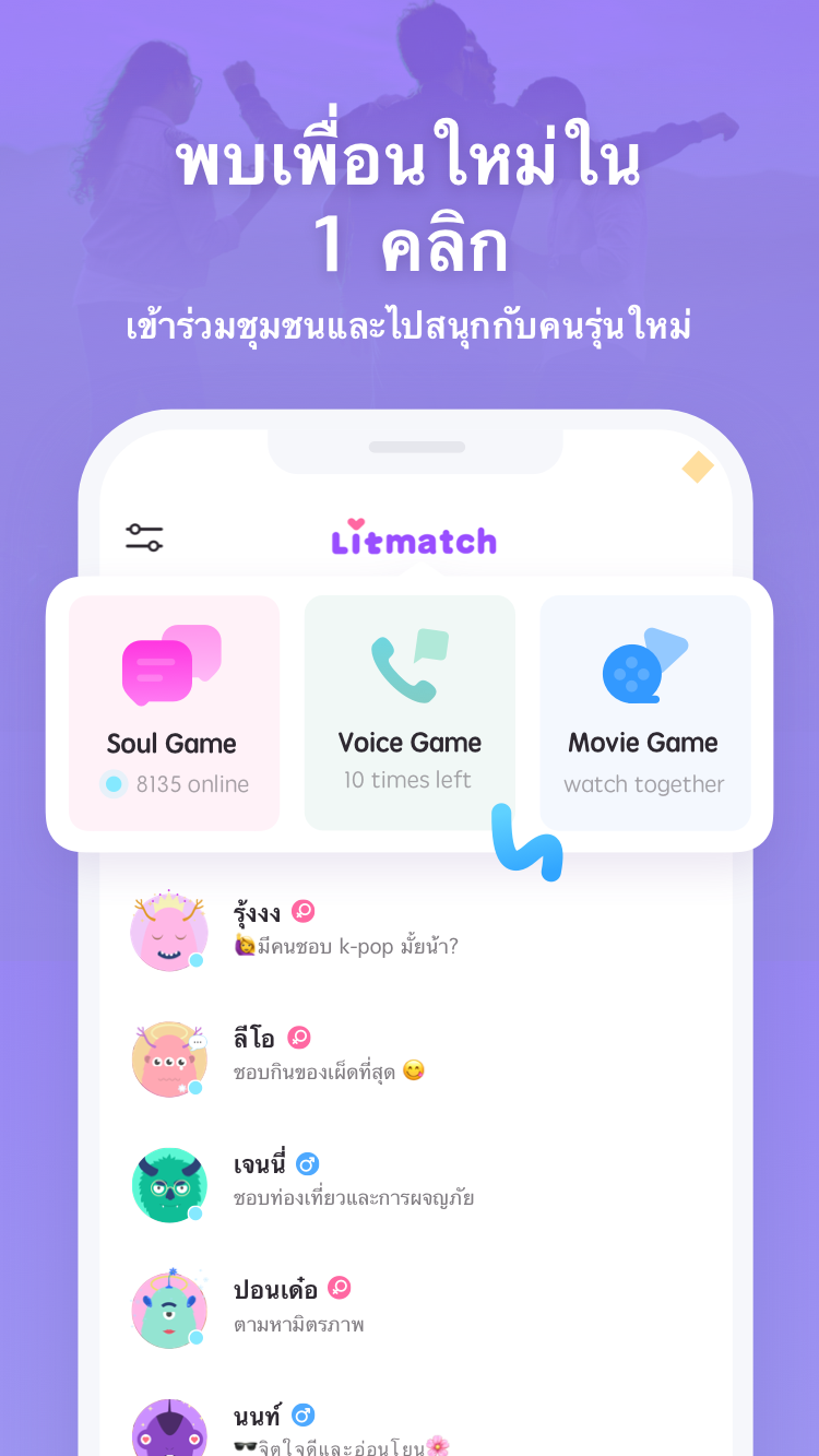 สำหรับใครที่อยากหาแค่เพื่อนคุยเล่นยามว่างเฉย ๆ ขอแนะนำแอป LitMatch ที่สามารถสุ่มคู่สนทนาได้เพียงปลายนิ้วสัมผัสโดยที่ไม่เห็นหน้า ไม่มีข้อมูลใด ๆ เลย ตัวแอปจะให้เวลา 180 วินาที ในการพูดคุยทำความรู้ หากการสนทนาเป็นไปได้ด้วยดี ก็สามารถกดไลค์ให้กันและกันเพื่อเพิ่มเพื่อน หรือดูโปรไฟล์ของคู่สนทนาได้ทันที นกไม่นกก็วัดกันที่ 3 นาที แรกนี่แหละ