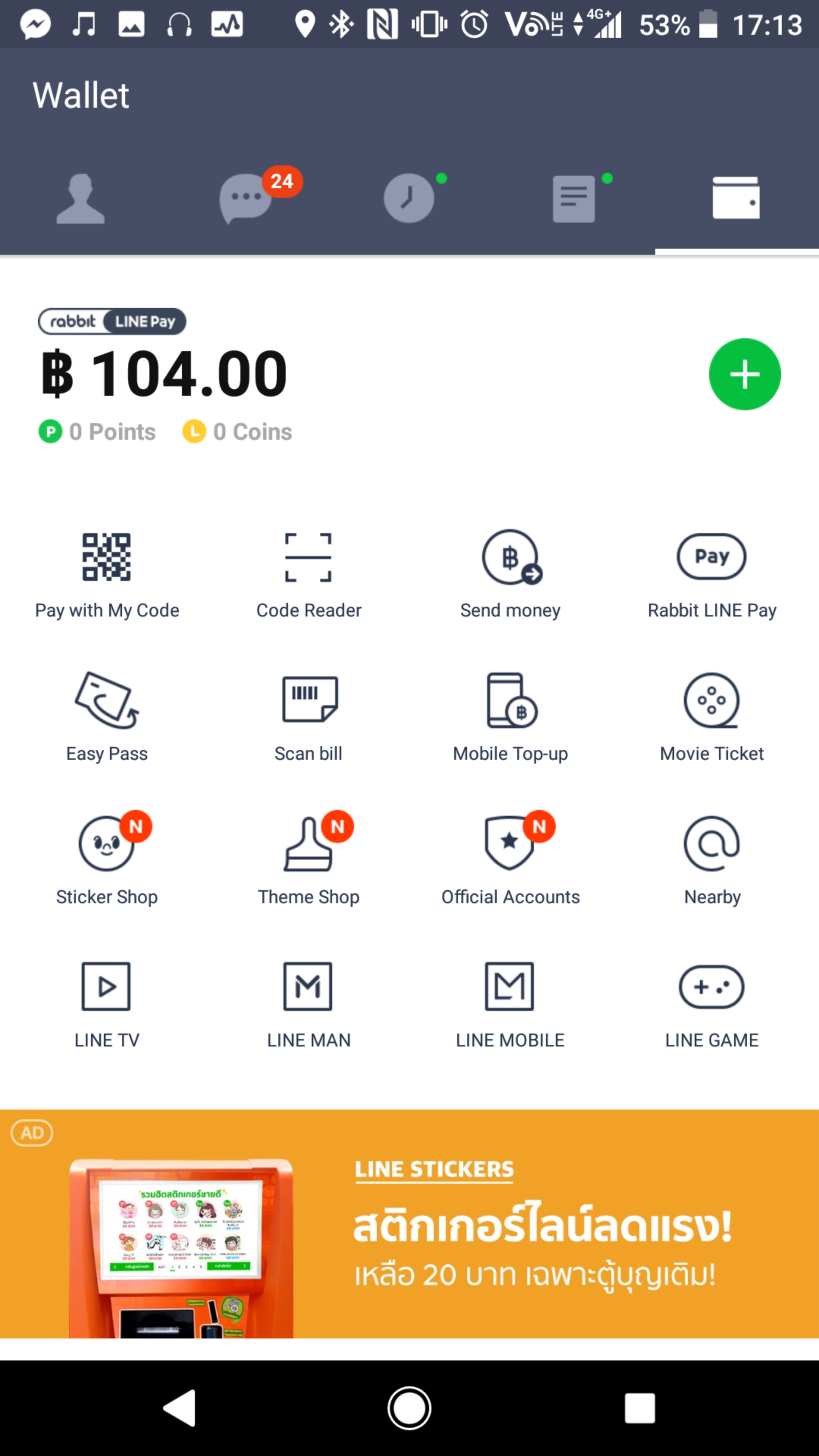 หากยังไม่เคยใช้งาน Rabbit LINE Pay มาก่อน สามารถลงทะเบียนใช้งานได้จากในแอป LINE ได้เลยนะครับ โดยไปยังแท็บสุดท้ายที่เขียนว่า Wallet และกดสร้างบัญชีก่อน หากไม่สร้างบัญชีจะยังไม่สามารถกดใช้ฟีเจอร์ BTS ได้นะครับ ซึ่งการเปิดใช้งานครั้งแรกเราจะต้องส่งเอกสารเพิ่มเติมเข้าไปด้วยนะ