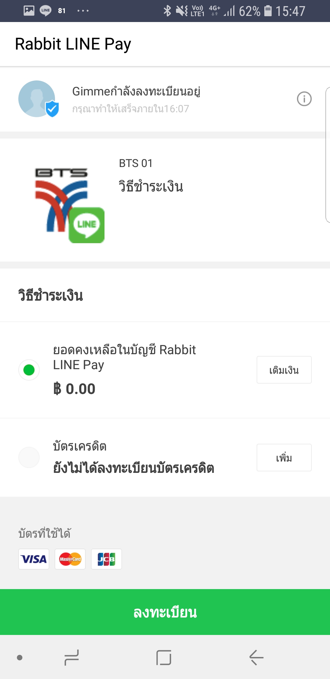 หากมีบัญชีอยู่แล้วมันก็จะขึ้นมาให้กดลงทะเบียนบัตรแบบนี้ โดยเราสามารถไปหาเลขบัตร Rabbit ได้ด้านหลังบัตรเลย