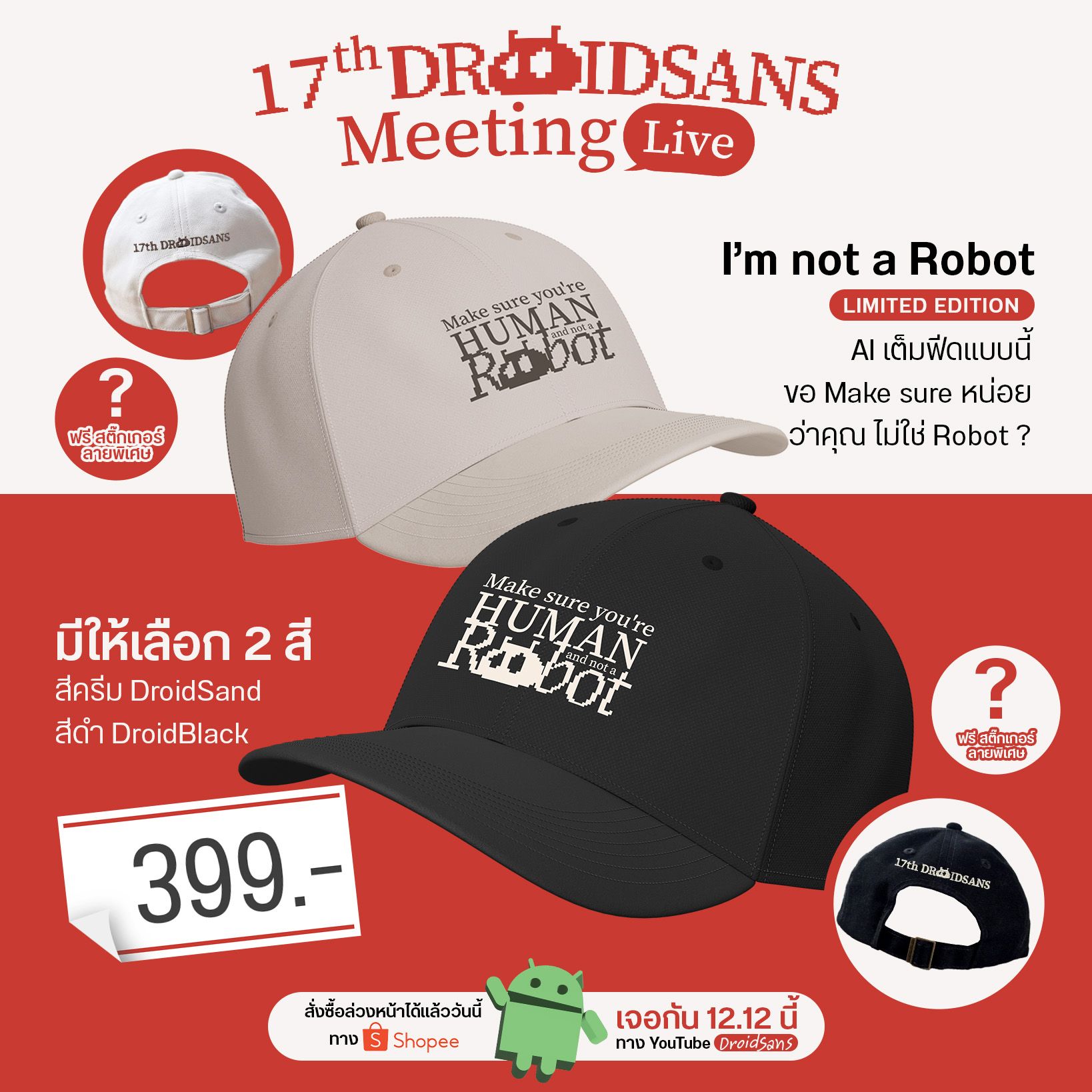 มีเสื้อยืดแล้วจะไม่มีหมวกไปได้ยังไง ! ปีนี้พวกเรา DroidSans ขอนำเสนอหมวกแก๊ปสุดเท่ ใส่แมตช์กับเสื้อ I’m not a Robot หรือเสื้อเสถียรก็ดี มีให้เลือกถึงสองสี ได้แก่ สีครีม DroidSans และสีดำ DroidBlack ใส่แล้วหล่อเท่ แคล้วคลาดไม่โดน AI หลอก !?