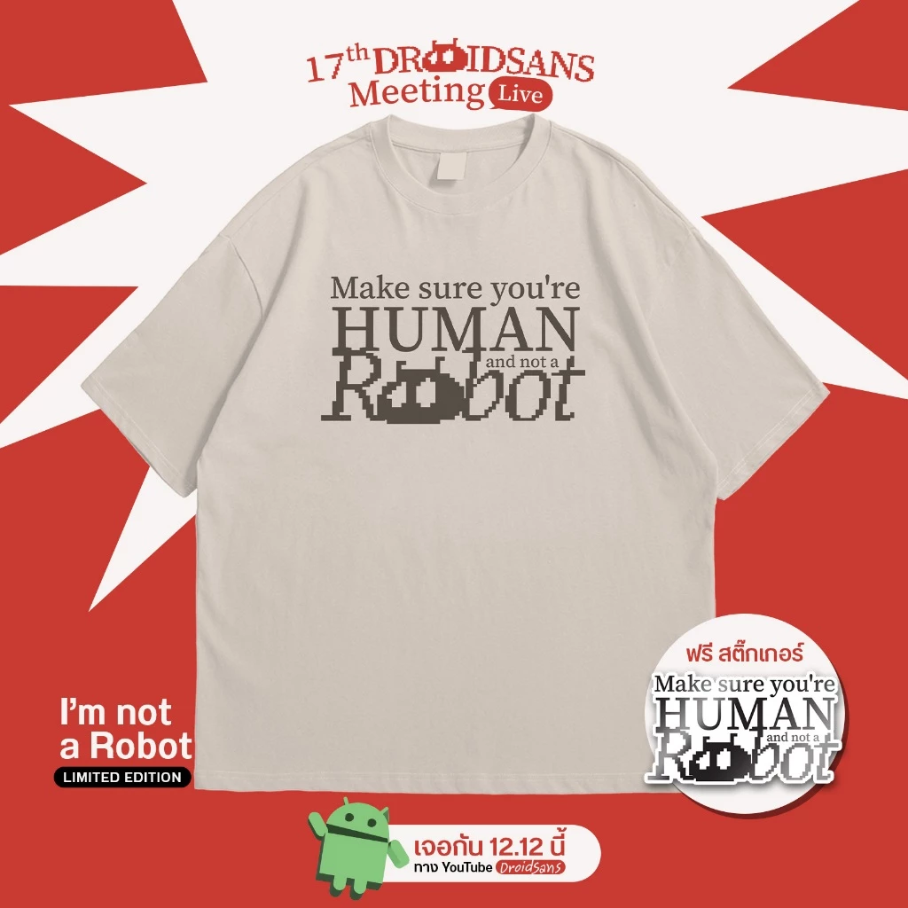 เมื่อ AI กำลังจะครองโลก หน้าฟีดก็เต็มไปด้วยคอนเทนต์ที่ทำด้วย AI เต็มไปหมด ! ถึงเวลที่จะก้าวออกมาเพื่อบอกให้ทุกคนได้รู้ว่า “เราไม่ใช่ Robot” ว่าแต่คนที่กำลังอ่านข้อความบนเสื้อตัวนี้อยู่จะเป็นมนุษย์หรือเปล่า DroidSans การันตีให้ไม่ได้นะ อาจต้องไปหาวิธีพิสูจน์กันเอาเอง
