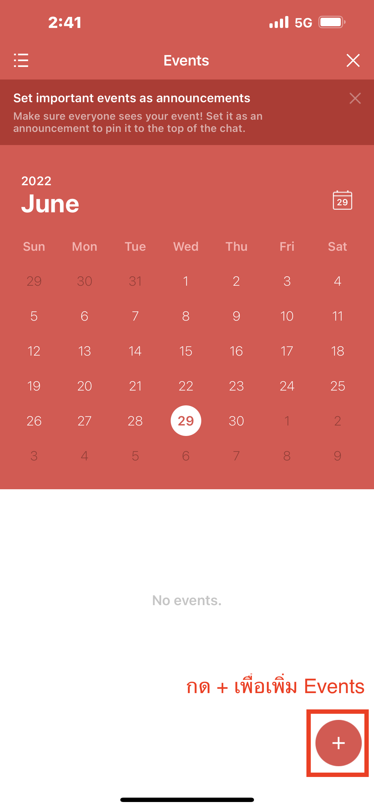 เมื่อเข้าไปที่หน้าแชทกลุ่ม หรือเเชทเดี่ยว กดเลือกที่ปุ่ม “สามขีด” ขวามือด้านบน > เลือกที่ “Events” > พอเข้ามาถึงตรงนี้ จะมีตัวเลือกปฏิทินขึ้นมาให้เราสามารถเลือกวันที่ๆต้องการได้จะสร้าง Events ได้โดยการกด “+” ได้เลย