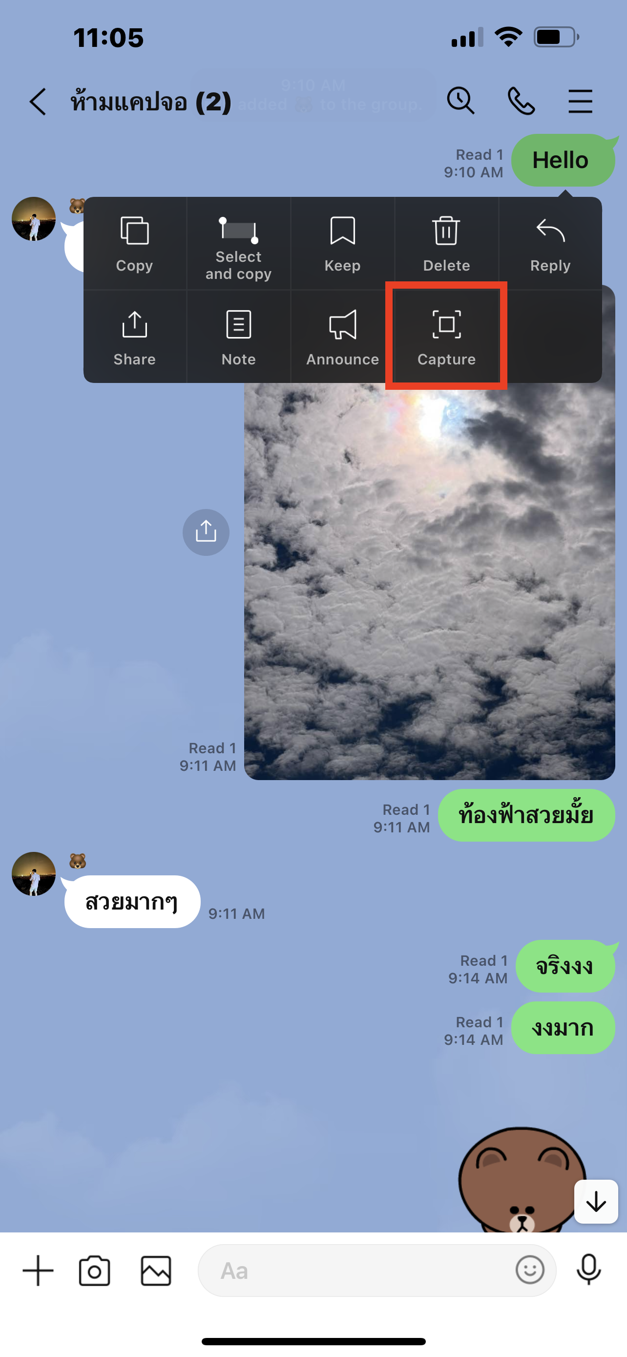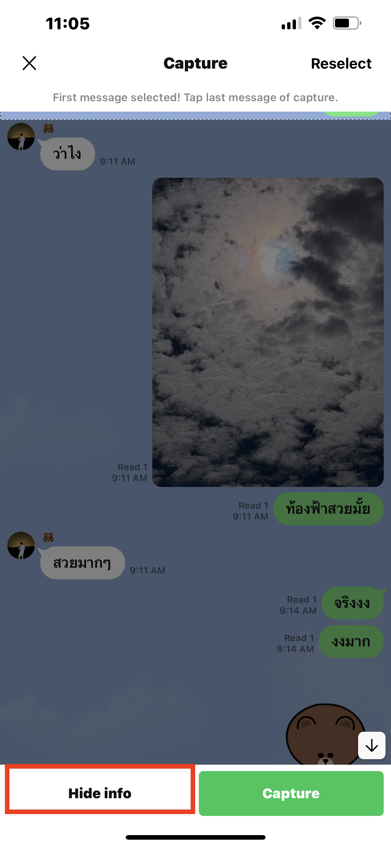 ขั้นตอนแรกจากหน้าห้องแชท ให้เรากดค้างที่ข้อความที่ต้องการจะแคป และเลือกเครื่องมือ “Capture” เพื่อทำการเริ่มแคปหน้าจอ สังเกตุปุ่ม “Show info” และ “Hide info” ตรงนี้เราสามารถกด เปิด-ปิด เพื่อซ่อนรูปโปรไฟล์และชื่อของเพื่อนที่เราสนทนาได้ด้วย เพื่อเพิ่มความเป็นส่วนตัวให้อีกฝ่ายนึง