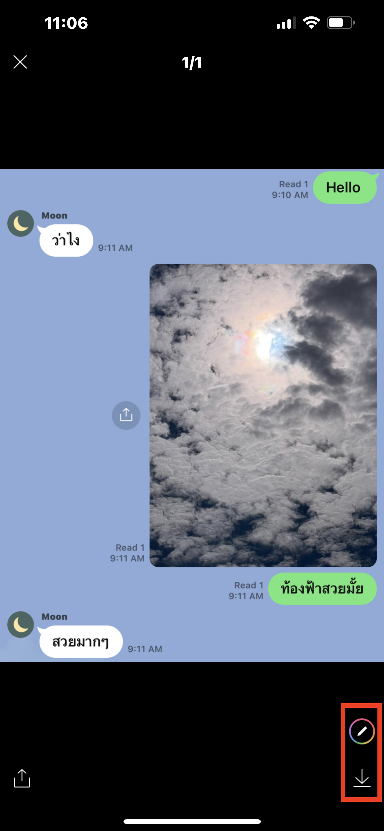 เมื่อเราได้เลือกส่วนของแชทที่ต้องการทั้งหมดแล้ว กดที่ “Capture” LINE จะพาเราไปดูภาพพรีวิวที่เราจะได้ก่อนออกมาว่าหน้าตาเป็นอย่างไร ตรงนี้เราสามารถวาดเขียนโน้ต หรือทำไฮไลท์เพิ่มเติมได้ ที่ “ปุ่มรูปดินสอ” แล้วถ้าเรียบร้อยแล้วสามารถกด “ปุ่มดาวน์โหลด” เพื่อเซฟรูปลงเครื่องได้เลย