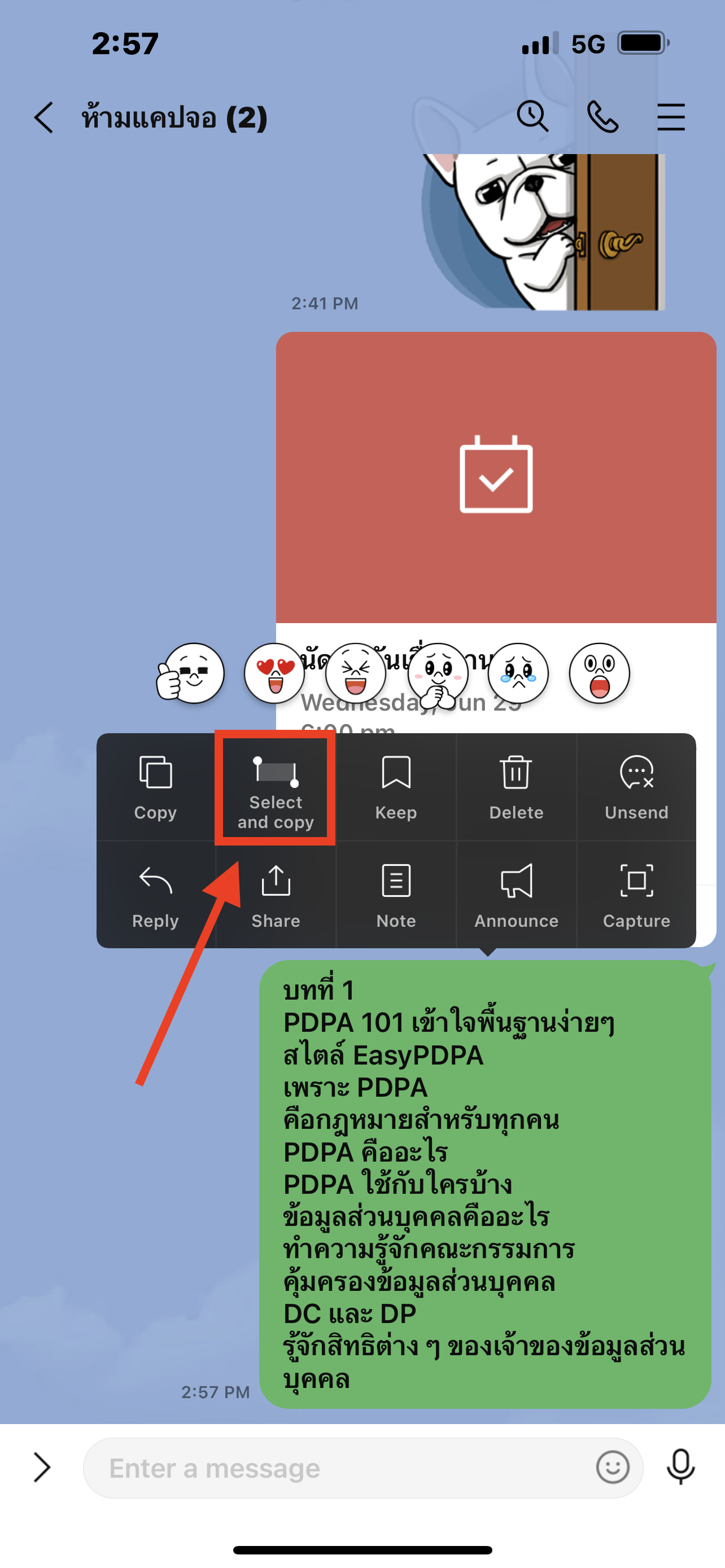 เราสามารถใช้ฟีเจอร์นี้ได้จากห้องแชท โดยเลือกจากข้อความที่เราต้องการจะ Copy และกดค้าง จะมีตัวเลือกขึ้นมา ให้เลือกที่ Select and copy > LINE จะโฟกัสตรงข้อความที่เราต้องการจะ Copy ตรงนี้เราสามารถลากเลือกเฉพาะส่วนที่เราต้องการได้เลย และกด Copy > และกด Paste จากช่องความข้อความที่เลือกได้เลย