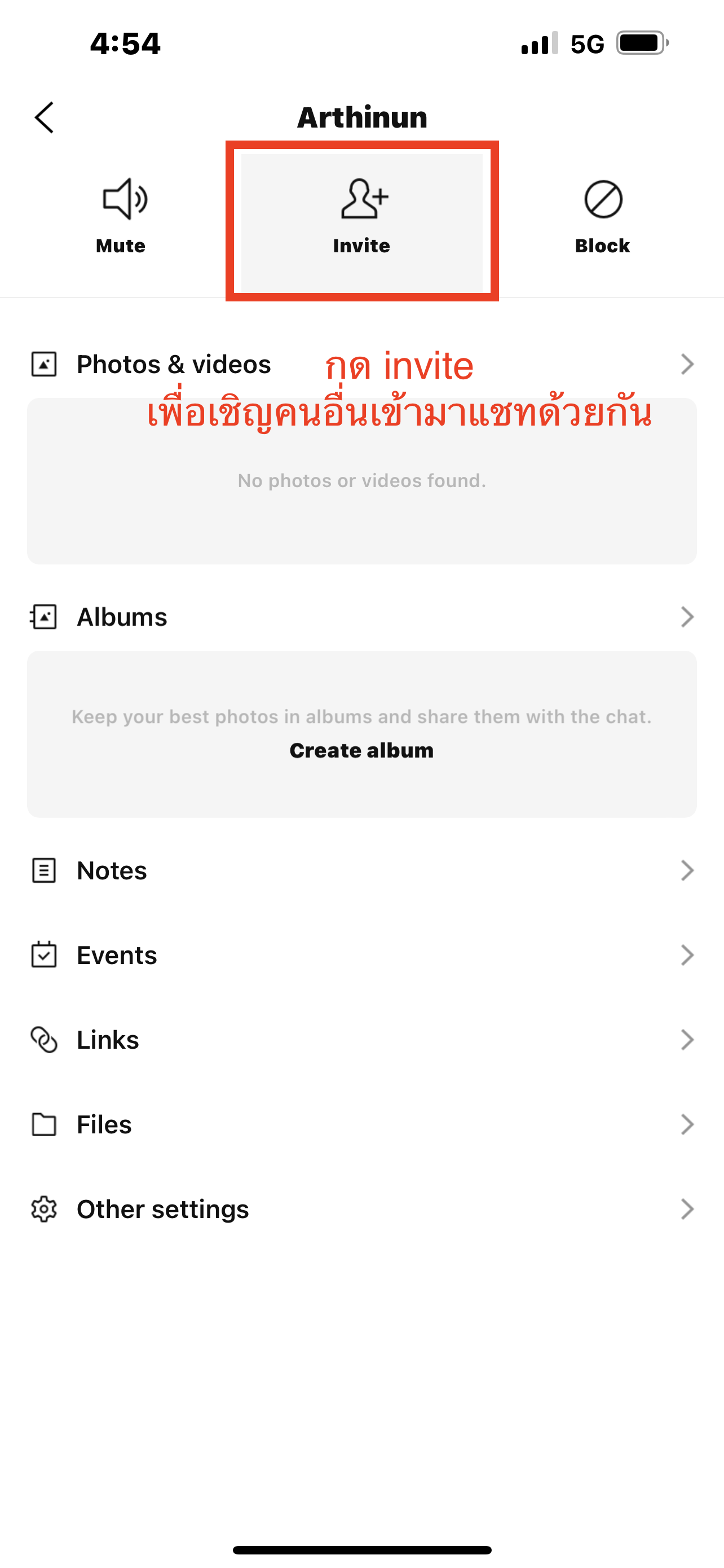 สร้าง Chat with multiple members ได้ กดเลือกที่ปุ่ม “สามขีด” > เลือก Invite เพื่อเชิญเพื่อนเข้ามา > หลังจากเลือกเพื่อนเรียบร้อยตรงนี้ ถ้าเราตั้งชื่อ กลุ่ม = สร้าง Group แต่ถ้าไม่ตั้งชื่อจะเป็นการสร้าง Chat with multiple members