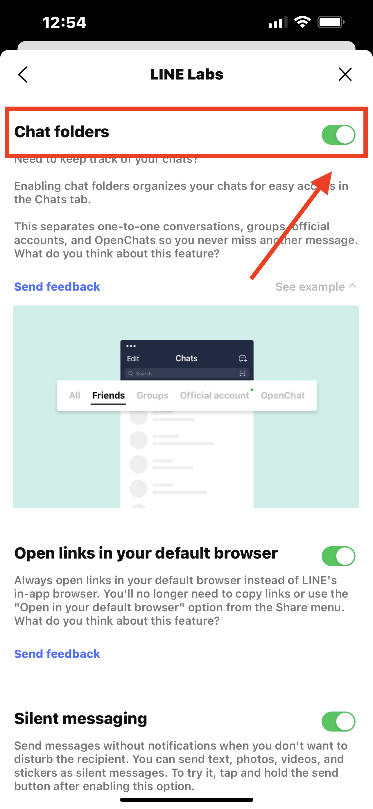 เข้าไปใน LINE Settings และเลือกที่ “LINE Labs” > เมื่อเข้ามาแล้วเลือก เปิด “Chat folders” ด้านล่างจะตัวอย่างให้เราดูด้วยนะว่าหลังเปิดแล้วหน้าตาจะเป็นอย่างไร > เมื่อเปิดฟีเจอร์นี้แล้วออกมาสังเกตุในหน้าแชท จะเห็นโฟลเดอร์ที่เพิ่มขึ้นมาแบ่งตามประเภทห้องแชท