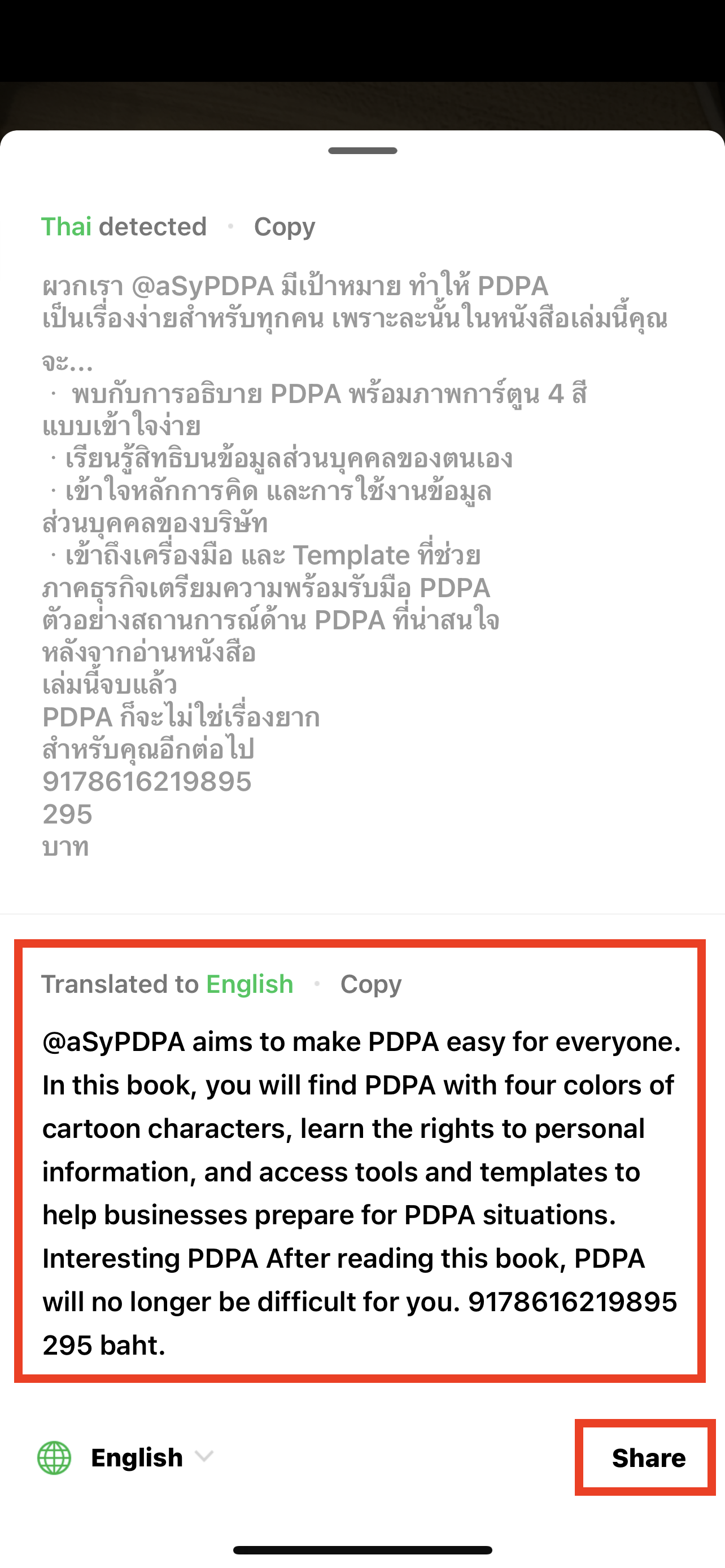 หลังจาก Detect หาตัวหนังสือได้แล้ว จะมีสีเขียวคลุมอยู่บนตัวหนังสือที่ตรวจจับได้ ตรงนี้เราสามารถเอานิ้วปัดลากเฉพาะส่วนที่ต้องการได้อีกทีด้วย > ตัวหนังสือทั้งหมดที่เราเลือกจะขึ้นมาอยู่ในกรอบสีขาว ตรงนี้เราเลือกที่จะแปลเป็นภาษาอังกฤษได้ด้วยนะ โดยกดที่ “Translate to English” > พอเราได้ข้อความที่ต้องการแล้ว สามารถ กดที่ปุ่ม “Share” ได้เลย ข้อความที่แปลหรือตรวจจับมาได้ จะใส่ไปในช่องแชทข้อความได้แบบอัติโนมัติเลยทันที พร้อมส่งได้เลย