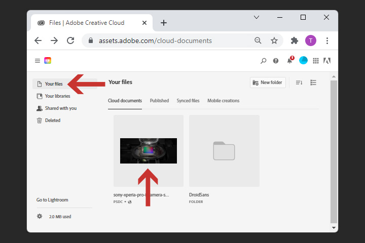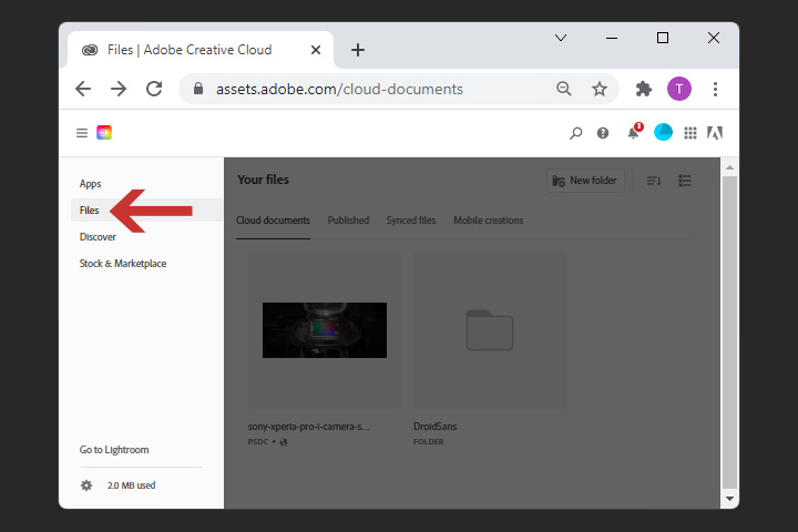 - จากหน้าเว็บ Creative Cloud ให้กดที่แท็บ “Files” (โปรแกรม Creative Cloud เวอร์ชันเดสก์ท็อปยังไม่รองรับฟีเจอร์นี้)