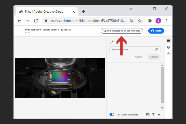 - เปิดไฟล์ภาพที่ต้องการ แล้วกด “Open in Photoshop on the web beta” ที่บริเวณมุมขวาบนของหน้าจอ