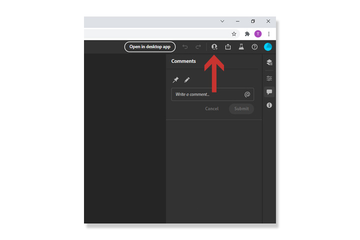 - จากโปรแกรม Photoshop บนเว็บ ให้กดที่ไอคอน “Share doccument” บริเวณมุมขวาบน (เป็นรูปคนพร้อมเครื่องหมายบวก)