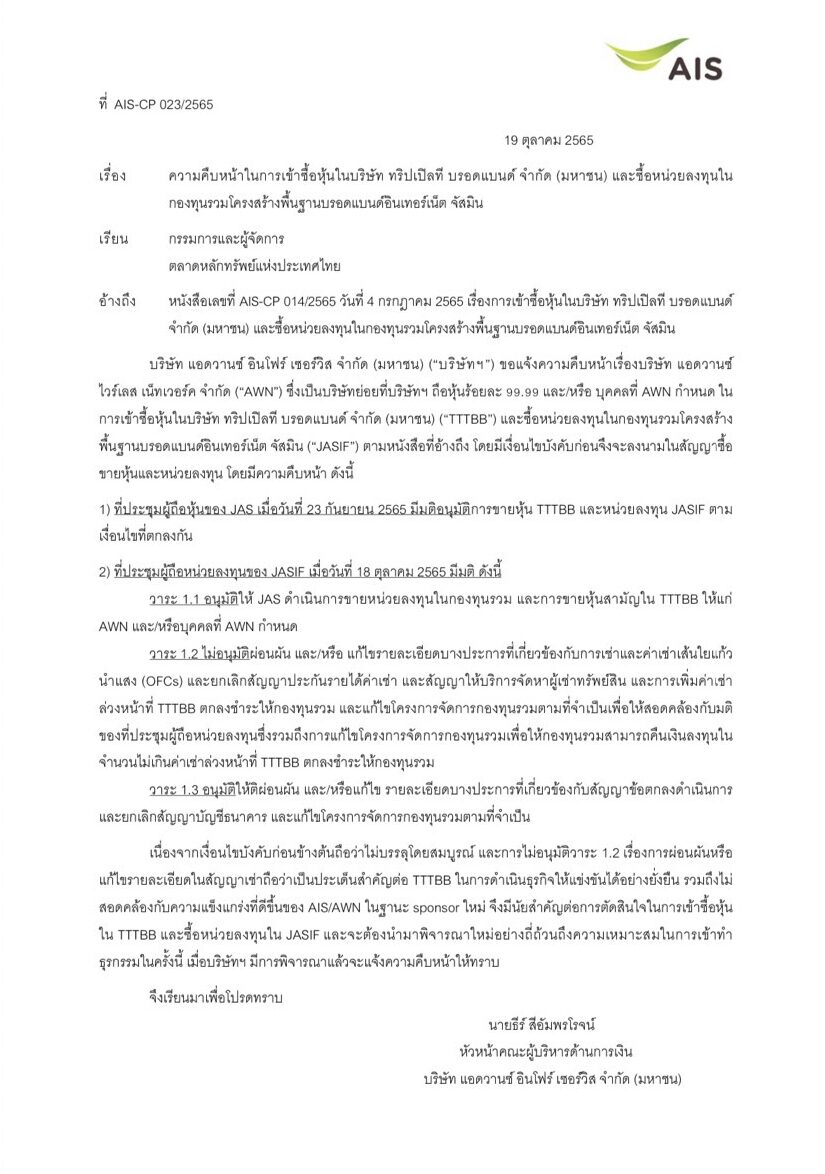 บริษัท แอดวานซ์ อินโฟร์ เซอร์วิส จำกัด (มหาชน) หรือ AIS ได้แจ้งกับตลาดหลักทรัพย์ฯ ว่า ได้มีการประชุมผู้ถือหุ้นจัสมิน (JASIF) กรณีการขายหน่วยลงทุนในกองทุนรวม และ การขายหุ้นสามัญของ บริษัท ทริปเปิลที บรอดแบนด์ จำกัด (มหาชน) เจ้าของ 3BB แต่ได้มติ ‘อนุมัติ’ มาเพียง 2/3 ของสัญญา
