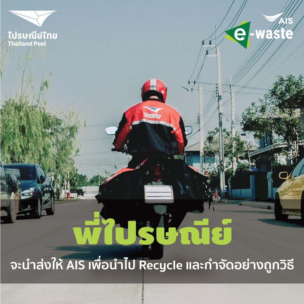 คราวนี้ทาง AIS ก็เลยไปจับมือกับไปรษณีย์ไทย จัดโครงการใหม่ขึ้นมาเป็น “เก็บตัวได้…แต่อย่าเก็บ E –Waste” เพื่ออำนวยความสะดวกและลดความเสี่ยงลงไป เพราะสามารถฝากทิ้งขยะอิเล็กทรอนิกส์ให้กับบุรุษไปรษณีย์ที่ขี่ผ่านหน้าบ้านของเราได้โดยไม่มีค่าบริการใด ๆ ทั้งสิ้น