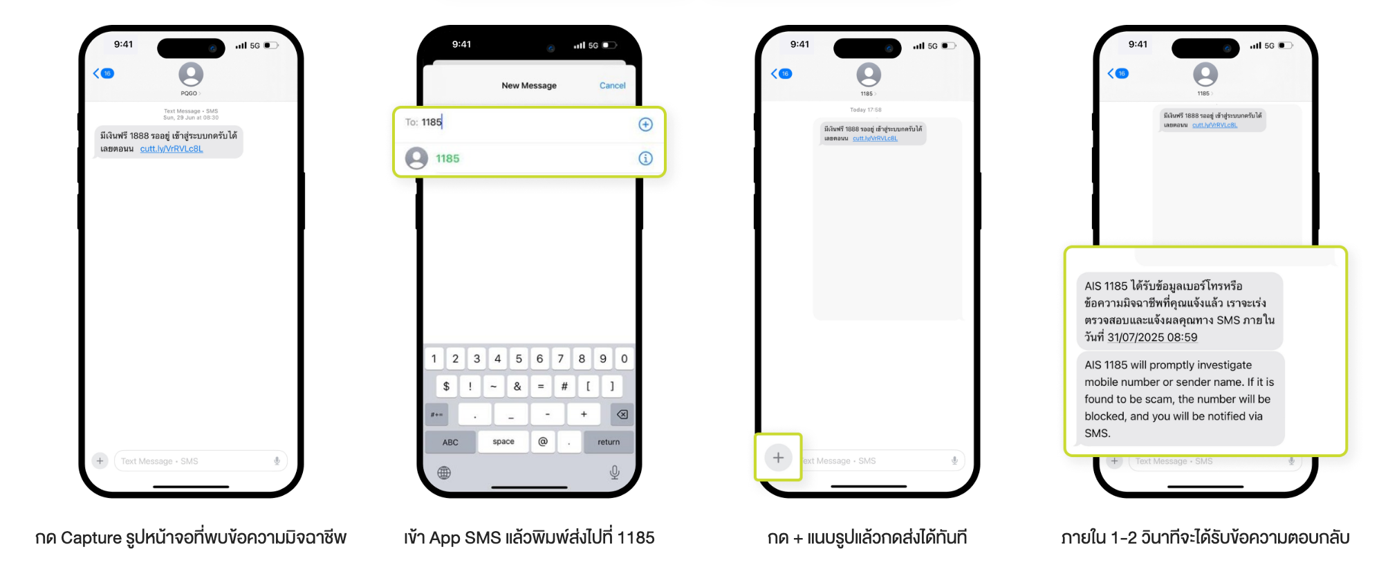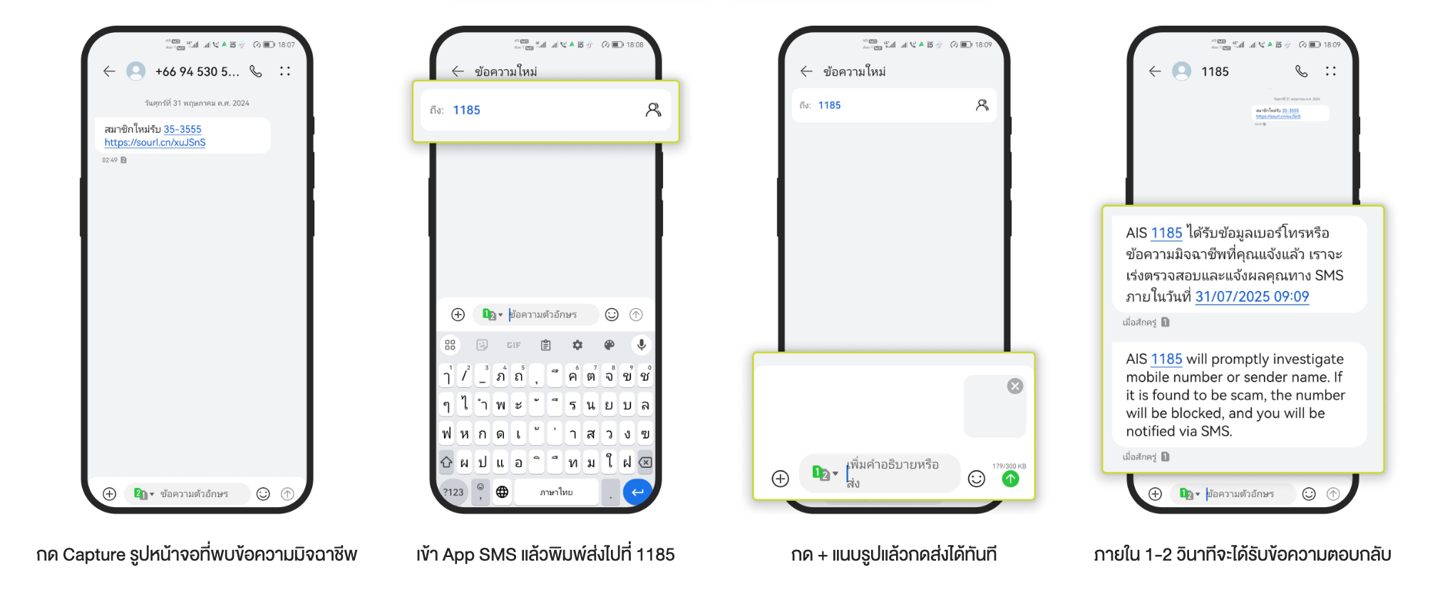 AIS เปิดบริการใหม่ “1185 แชะแล้วแชร์ แจ้งเบาะแส SMS หลอกลวง” ช่องทางใหม่สำหรับลูกค้า AIS ในการแจ้งเบาะแสข้อความ SMS จากมิจฉาชีพด้วยตัวเอง ทำได้ง่าย ๆ และรวดเร็ว รู้ผลลัพธ์ภายใน 24 ชม. ไม่มีค่าใช้จ่าย ทำได้ทั้ง Android กับ iOS