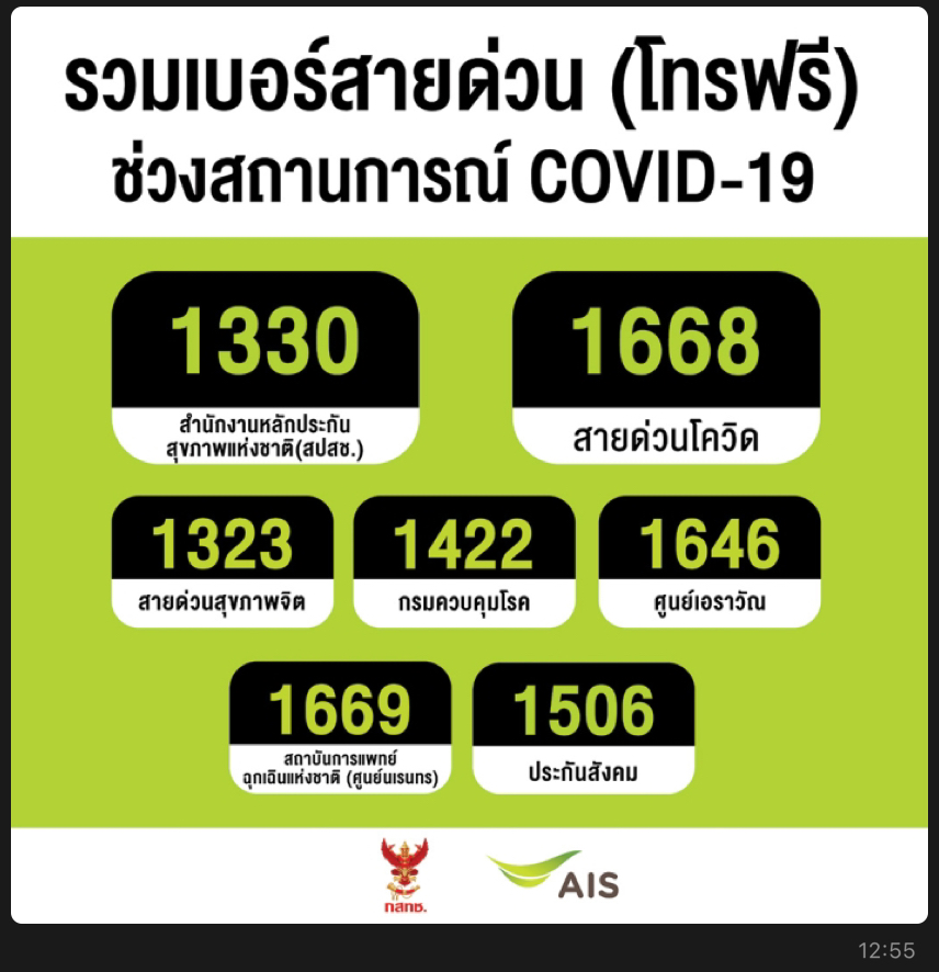 - ✆ 1330 [สปสช] สายด่วนช่วยเหลือผู้ที่ติดเชื้อโควิด-19 ที่ยังไม่ได้รับการดูแลรักษาในโรงพยาบาล 24 ชม.