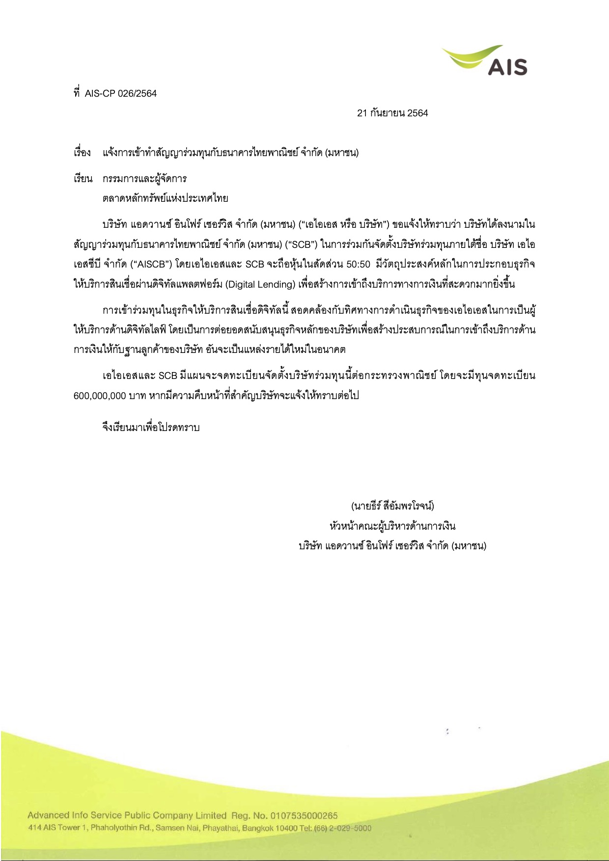 อย่างไรก็ดียังไม่มีการเปิดเผยรายละเอียดความร่วมมือในครั้งนี้ออกมามากนัก แต่ในเย็นวันนี้ทาง SCB เตรียมมีจัดแถลงข่าว “SCB ≠ SCB” คาดว่าน่าจะมีการเปิดเผยถึงดีลนี้มากขึ้น เพราะความร่วมมือครั้งนี้น่าจะไม่ใช่แค่ความร่วมมือในเชิงกลยุทธ์ แต่เป็นการเล่นใหญ่จัดหนัก โดยทุนจดทะเบียนของบริษัทเอไอเอสซีบีนี้ สูงถึง 600 ล้านบาท