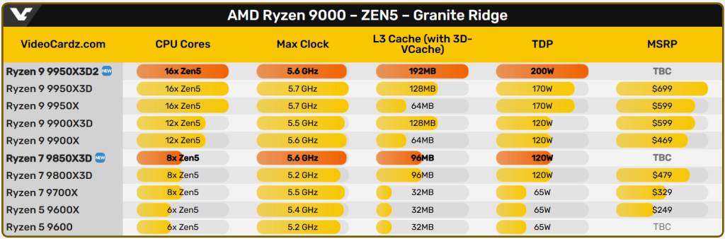 นอกจากนี้ chi11eddog ยังเผยข้อมูลของ Ryzen 7 9850X3D อีกหนึ่งรุ่นที่มี 8 คอร์ 16 เธรด ความเร็วพื้นฐาน 4.7 GHz บูสต์สูงสุด 5.6 GHz ค่า TDP 120W และแคช L3 ขนาด 96MB ดูจากสเปกแล้วเรียกได้ว่าเป็น Ryzen 7 9800X3D เวอร์ชันเพิ่มความแรงขึ้นมาอีกขั้น เหมาะกับสายเกมมิ่งที่อยากได้ความเร็วสูงขึ้นแต่ยังคุมพลังงานได้ดี
