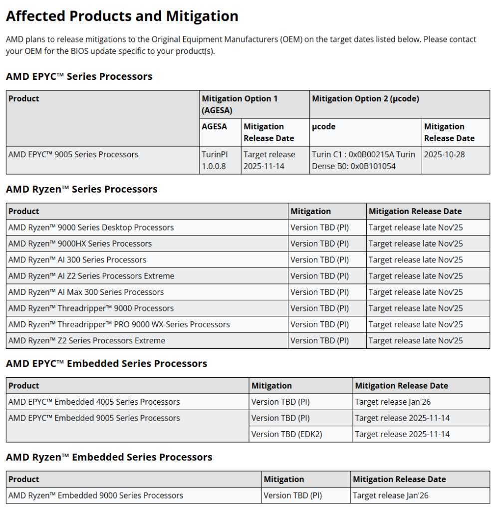 ซีพียูที่ได้รับผลกระทบมีทั้ง Ryzen 9000, Ryzen AI 300, Threadripper 9000, และ Ryzen Z2 รวมถึงฝั่งเซิร์ฟเวอร์อย่าง EPYC 9005 ที่ได้รับอัปเดตแก้ไขไปแล้ว สำหรับรุ่นผู้ใช้ทั่วไป AMD เตรียมปล่อยอัปเดตแก้ผ่าน AGESA firmware ช่วงปลายเดือนพฤศจิกายน 2025 และจะทยอยครอบคลุมถึงต้นปี 2026