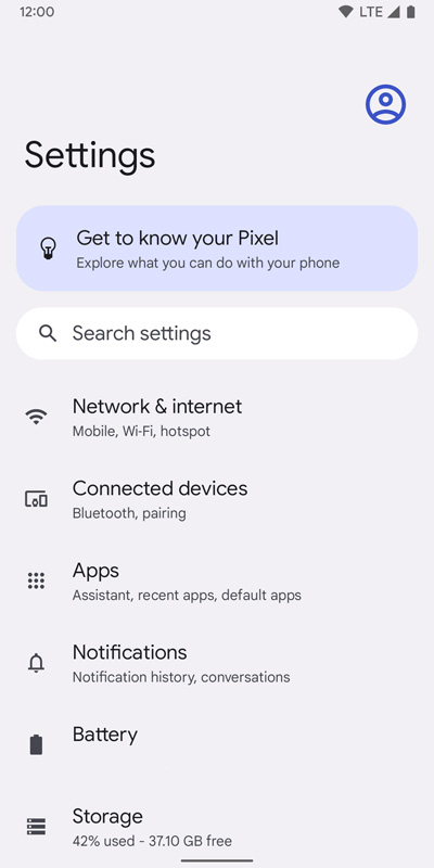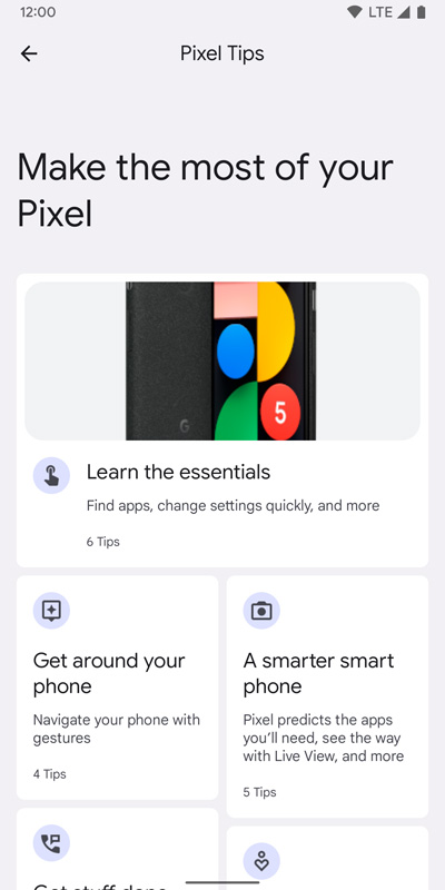 อินเทอร์เฟซในส่วนของ Settings จะไม่มีวงกลมสี ๆ รอบไอคอนอีกต่อไป เหลือแต่ไอคอนเพียงอย่างเดียว ดูเรียบง่ายกว่าเดิมมาก และเมื่อแตะไปที่ Pixel Tips ที่ด้านบนสุดจะพบกับดีไซน์ที่ถูกปรับปรุงใหม่เช่นกัน จากเดิมที่เป็นการ์ดเรียงซ้อนกันลงมาเรื่อย ๆ ตอนนี้เปลี่ยนรูปแบบใหม่เป็นช่อง ๆ เล็กบ้าง ใหญ่บ้าง และเพิ่มลูกเล่นเกี่ยวกับสีเข้าไปนิดหน่อยให้สอดคล้องกับ Material You (น่าเสียดายที่ผมไม่ได้แคปภาพ Pixel Tips แบบเก่าเอาไว้)