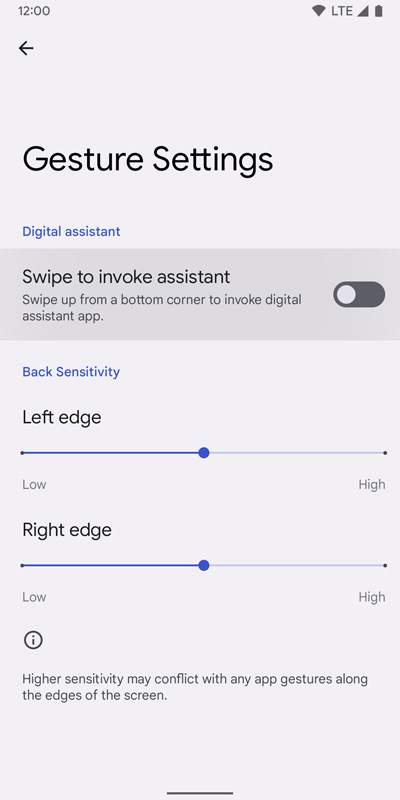 สามารถตั้งค่าเพื่อปิดการเรียก Assistant จากมุมหน้าจอเมื่อเลือกใช้งานแถบการนำทางด้วยท่าทางได้แล้ว จาก Settings ให้เข้าไปที่ System → Gestures → System navigation → Gesture navigation ตามลำดับ แล้วเลือกปิด Swipe to invoke assistant