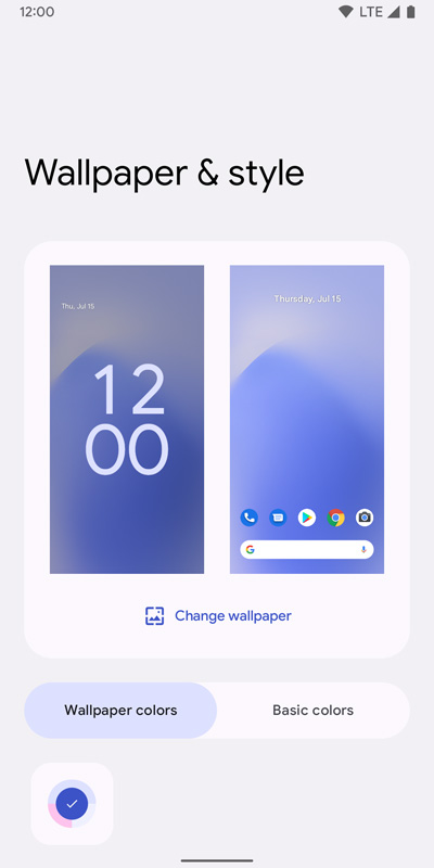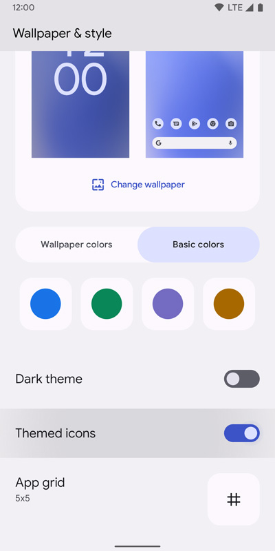 สุดท้าย แต่ไม่ท้ายสุด กับ Wallpaper & style ที่เปรียบเสมือนเป็นศูนย์ควบคุมหลักของระบบธีมใน Android 12 เป็นหนึ่งในการเปลี่ยนแปลงที่สำคัญที่สุดของ Beta 3 โดยได้มีการเพิ่มตัวเลือก Basic colors เข้ามาในระบบสีของธีม เป็นอีกออปชันหนึ่งที่ผู้ใช้งานไม่ต้องไปยึดติดกับสีของวอลเปเปอร์ตามที่ระบบนำเสนอให้ ตอนนี้ยังเลือกได้แค่ 4 สี คือ น้ำเงิน เขียว ม่วง และน้ำตาล Google น่าจะใส่มาเพิ่มให้อีกในภายหลัง