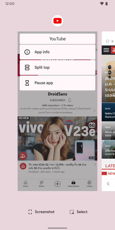ถัดมา ฟีเจอร์การแบ่งหน้าจอถูกเปลี่ยนชื่ออีกครั้ง จาก Split sceen ใน Android 12 หรือต่ำกว่า กลายเป็น Pin to top ใน Android 12L Beta 1 และล่าสุดคือ Split top ใน Android 12 L Beta 2 พร้อมกันนี้ก็ได้ปรับขอบของแอปบนและล่างในโหมด App pairs ให้มีความโค้งมน สอดคล้องตามภาษาการออกแบบ Material you ของระบบด้วย