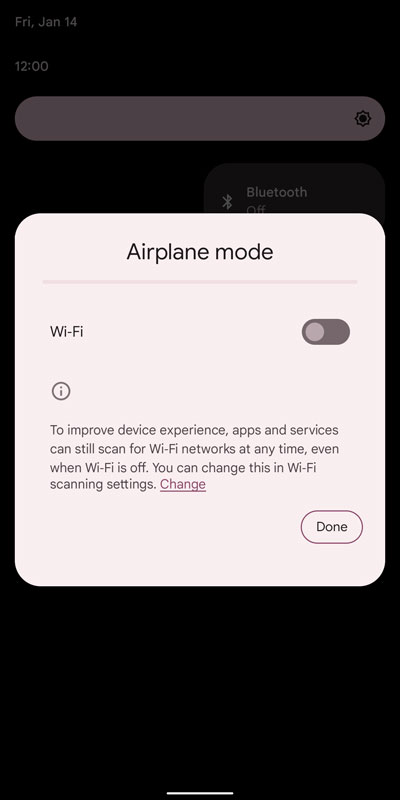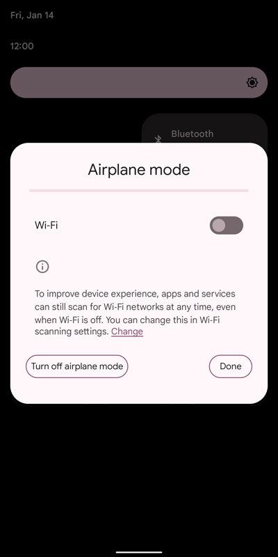 เมื่อเปิดโหมดเครื่องบินใน Android 12L Beta 2 ท็อกเกิลช็อร์ตคัตของ Wi-Fi จะมีเมนู Turn off air plane mode เพิ่มเข้ามา ทำให้สามารถเลือกได้ว่า ต้องการเปิด Wi-Fi แล้วอยู่ในโหมดเครื่องบินต่อ หรือปิดโหมดเครื่องบินทิ้งไปเลย ลดความซ้ำซ้อนในการใช้งาน จากเดิมต้องเลือกเปิดหรือปิดทีละอย่าง
