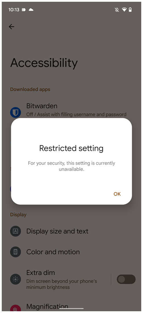 มีรายงานว่า Google จะทำการบล็อกแอปที่ติดตั้งผ่านวิธีไซด์โหลดด้วยไฟล์ APK จากแหล่งที่มาที่ไม่น่าเชื่อถือ ไม่ให้สามารถใช้งาน Accessibility API ได้ เริ่มจาก Android 13 เป็นต้นไป ทั้งนี้เพื่อความปลอดภัยของผู้ใช้งาน ลดความเสี่ยงจากแอปที่แฝงตัวเป็นมัลแวร์ ดักเอาข้อมูลส่วนตัวหรือแอบควบคุมอุปกรณ์โดยที่ผู้ใช้งานไม่รู้ตัว