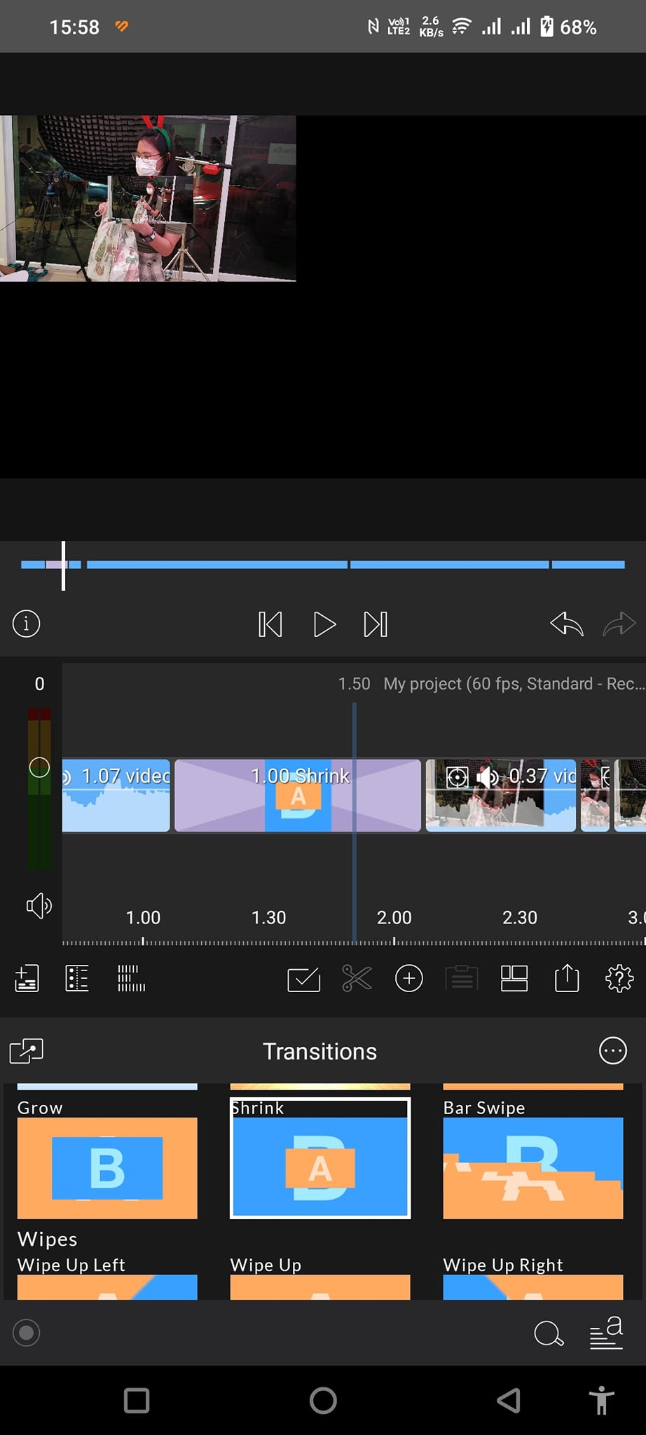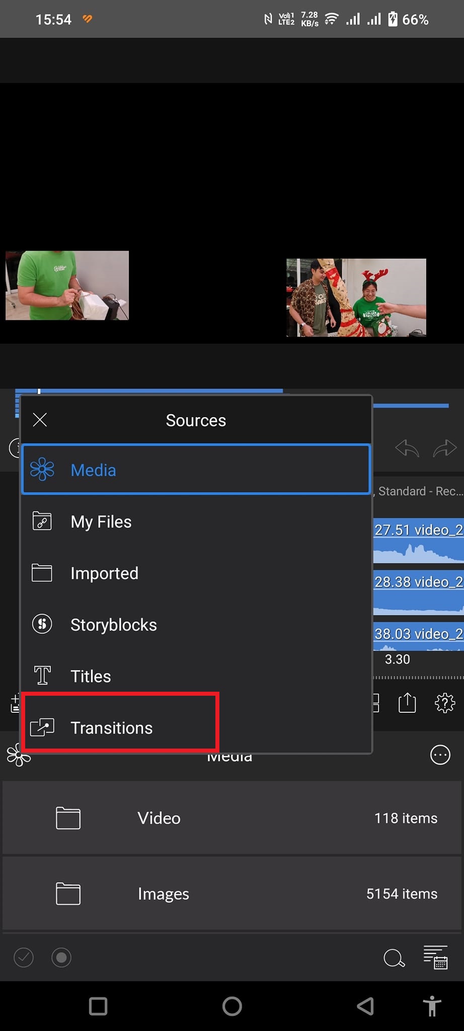 การใส่ Transition หรือเอฟเฟ็คท์เวลาเปลี่ยนฉากให้กดที่ปุ่มรูปดอกไม้ด้านซ้ายล่าง จากนั้นเลือก Transitions ที่เราต้องการแล้วลากไปไว้ตรงช่วงระหว่างคลิปได้เลย หากจะลบ Transition ทิ้งก็แค่จิ้มเลือกแล้วกดถังขยะแล้วค่อยเลือกแบบใหม่เอา