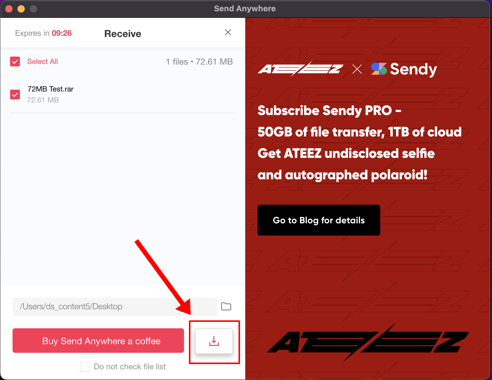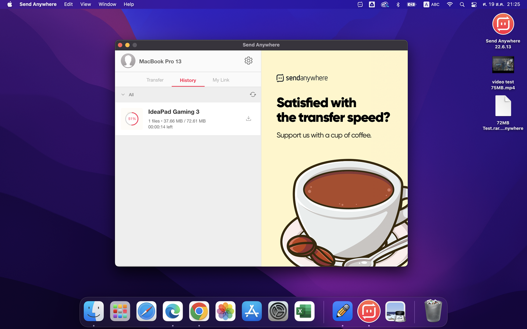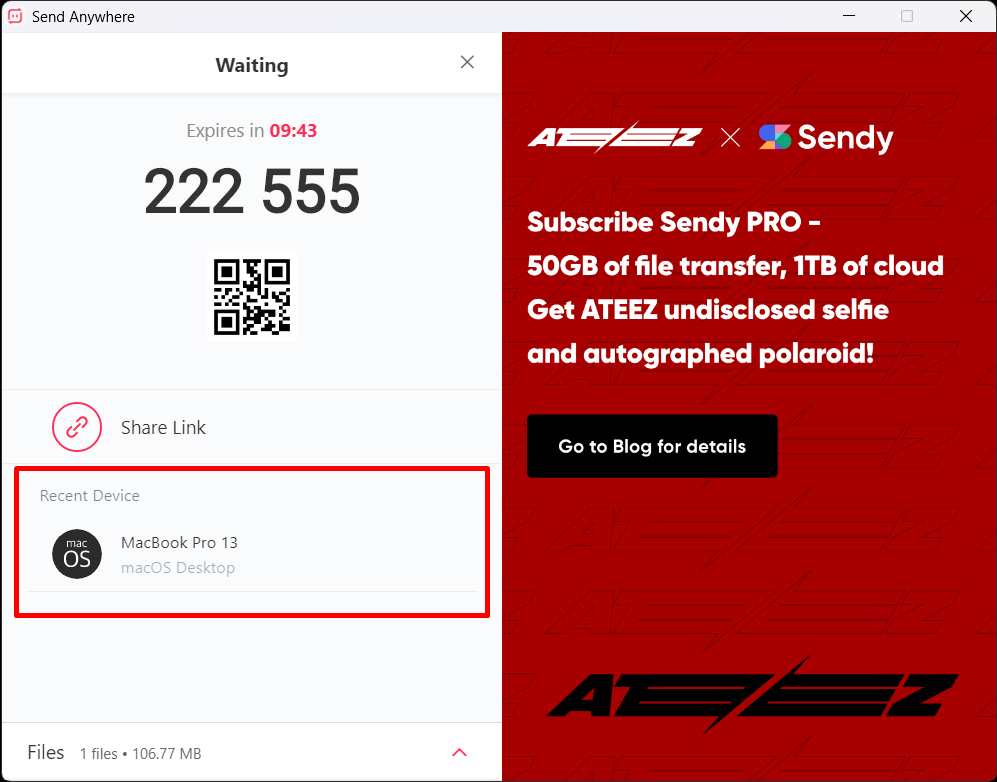 ครั้งนี้จะลองส่งไฟล์ขนาด 72MB ข้ามจากโน้ตบุ๊ค Windows ไปยังเครื่อง MacBook Pro 13 โดยนำรหัส 6 หลักจากเครื่องด้านบนมากรอก ซึ่งก็อย่างที่เห็นว่าจะต้องกรอกก่อนหมดอายุภายใน 10 นาที จากนั้นให้กดปุ่มยืนยันการรับไฟล์อีกครั้ง