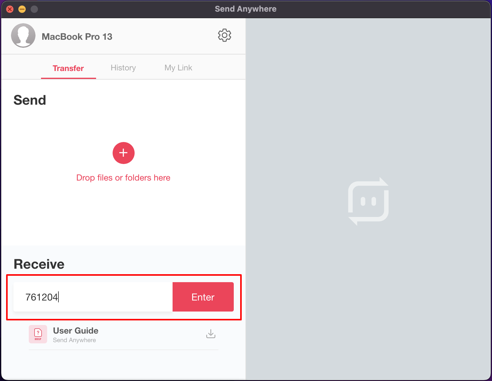 เมื่อลงแอปครั้งแรกและเปิดขึ้นมาจะพบหัวข้ออยู่ 3 ส่วนหลัก ๆ คือ Transfer สำหรับการรับ-ส่งไฟล์, History สำหรับดูประวัติไฟล์ที่เคยส่ง (ส่งไฟล์เก่าซ้ำได้) และ My Link สำหรับอัปโหลดไฟล์เก็บไว้เป็นลิงก์ก่อน แล้วส่งให้เครื่องปลายทางโหลดต่อทีหลัง