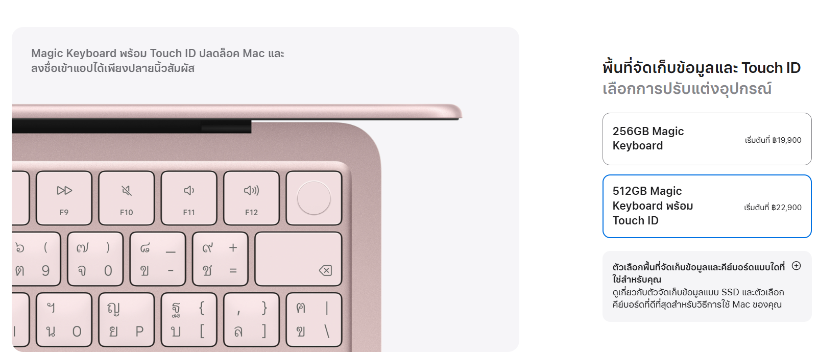 MacBook Neo เปิดราคาไทยเริ่มต้นมาที่ 19,900.- สำหรับความจุ 256GB ส่วนรุ่นท็อปสุด 512GB มีราคาอยู่ที่ 22,900.- ซึ่งจะได้ Touch ID เพิ่มมาด้วย กำหนดวันเปิดวางจำหน่ายในไทยยังไม่ประกาศออกมาอย่างเป็นทางการ