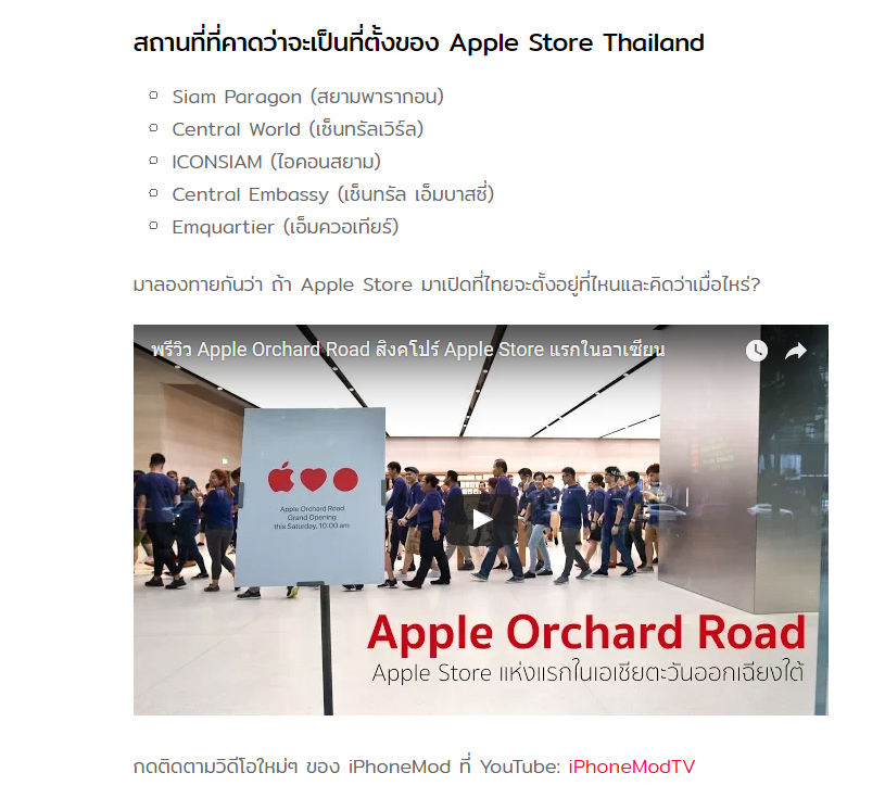 อีกสำนักหนึ่งที่เขียนข่าวเรื่องนี้ก็คือ iPhoneMod ที่บอกว่าได้ข่าวมาว่าแอปเปิลตกลงที่จะเข้ามาเปิด Apple Store ในไทยแล้วอย่างแน่นอน สำหรับข้อมูลสถานที่และวันเวลานั้นยังเป็นความลับ ทาง iPhoneMod ก็มองว่าเป็นข้อมูลที่มีความเป็นไปได้สูงเนื่องจากช่วงหลังทางแอปเปิลก็ได้รุกเปิดร้านในโซนเอเซียมากขึ้น และในภายหลังได้มีการอัปเดตเนื้อหาข่าวว่า Apple Store ในไทยนั้นจะตั้งอยู่ที่ ถนนเจริญนคร เขตคลองสาน กทม. ซึ่งไปตรงกับที่ตั้งของห้าง ICONSIAM ที่กำลังก่อสร้างอยู่พอดี และระบุอีกด้วยว่าข้อมูลที่ทางเว็บได้รับนั้นไปตรงกับที่ทาง Siampod รายงานด้วยเช่นกัน ทำให้ข้อมูลการของ Apple Store สาขาไทยนั้นมีน้ำหนักมากทีเดียว