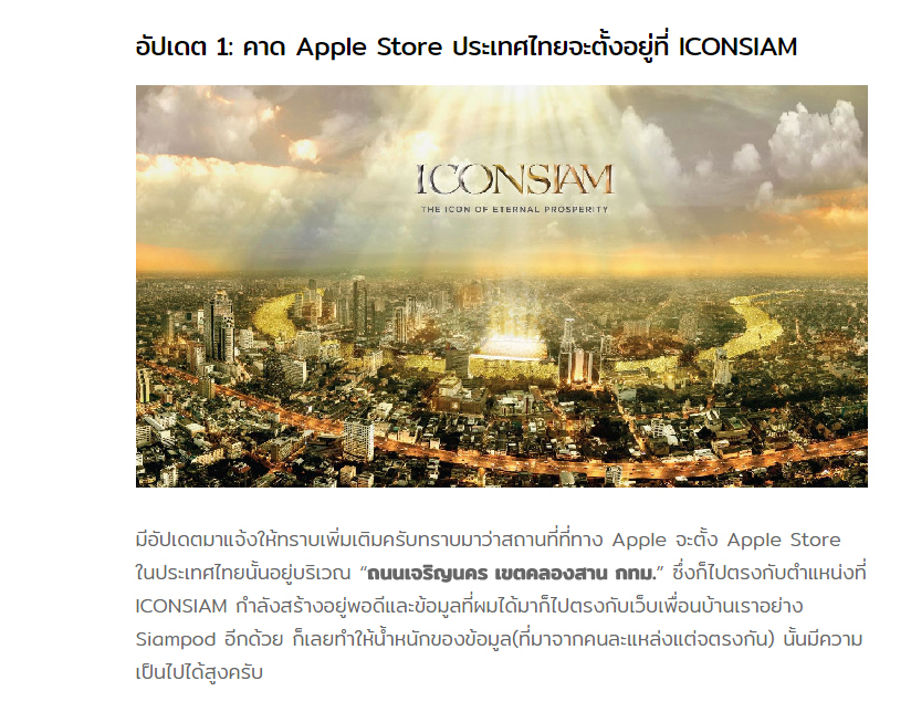 แต่ผมถามเพื่อนที่เป็นวิศวกร ที่เป็นทีมก่อสร้าง Iconsiam เขาก็บอกนะว่าจะมาสร้าง และกำลังสร้างอยู่ จริงๆ อาจจะอยากปิดเงียบก่อน กลัวจะไม่เซอไพรส์มากกว่า เพราะ ขนาดติ่งแอปเปิ้ลบางคน ยังไม่ทราบข่าวการมาครั้งนี้เลย ด้วยความเคารพ