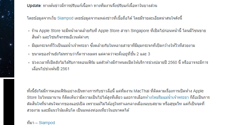 หลังจากนั้นทาง MacThai ก็เขียนข่าวโดยอ้างอิงจากทาง Siampod ว่าจากข่าวเมื่อช่วงปีที่ผ่านมาว่า Apple Store สาขาไทยกำลังจะมานั้น ในที่สุดก็รู้ที่ตั้งร้านที่แท้จริงแล้วคือห้างใหม่ริมเจ้าพระยา ที่จะเปิดตัวในช่วงต้นปี 2018 หรือปีหน้านั่นเอง และสรุปข้อมูลเกี่ยวกับตัวร้านว่าจะมีกระจกที่เห็นวิวแม่น้ำเจ้าพระยา ร้านน่าจะตั้งอยู่ที่ชั้น 2 และชั้น 3 ของห้าง และอ้างอิงจากกำหนดการเปิดให้บริการของห้าง ที่จะเปิดในช่วงปลายปีนี้หรืออาจจะเป็นช่วงต้นปีหน้า จึงคาดว่า Apple Store ก็จะพร้อมให้บริการในช่วงเวลาเดียวกัน ทาง MacThai ระบุว่าข่าวนี้ยังไม่ได้รับการยืนยันแต่อย่างใด แต่ก็คิดว่ามีความเป็นไปได้สูงและทำเลที่ตั้งนั้นก็น่าสนใจทีเดียว
