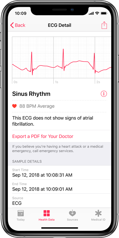 ตัวอย่างข้อมูลที่ได้จากแอป ECG ซึ่งเราสามารถ Export เป็น PDF ส่งให้แพทย์ดูได้ง่ายๆ