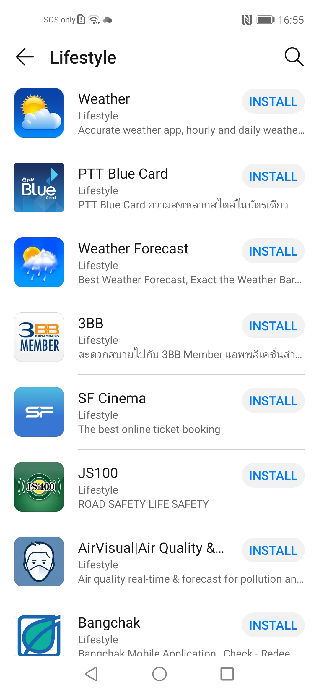 ทางด้านหมวด Lifestyle ของ App Gallery อาจจะดูแบ่งแปลก ๆ ต่างสโตร์อื่นอยู่เหมือนกัน โดยมีแอปที่น่าสนใจคือหลักๆ คือ TrueMoney Wallet, LINE MAN, 7-Eleven TH, Major Cineplex, Wongnai, SF Cinema, JS100 และ AirVisual ที่เป็นแอปสำหรับเช็คฝุ่น PM 2.5 ก็มีมาให้เช่นกัน