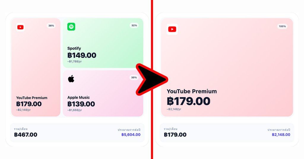 อย่างเช่น App Music Streaming หลายคนสมัครทั้ง Youtube Premium ที่มีทั้ง Youtube Music อยู่แล้ว และยังสมัคร Apple Music กับ Spotify ไว้อีก จะเห็นว่ามันทำงานซ้อนทับกันอยู่ ดังนั้นถ้าเรายกเลิกบริการออกเหลือเพียงตัวเดียว ค่าบริการรวมๆ จาก 467 บาท/เดือน จะลดลงทันที เหลือแค่ 179 บาท (ประหยัดไป 288 บาท/เดือน) หรือรวมๆ แล้วปีนึงเราประหยัดไป 3,456 บาทเลยนะ