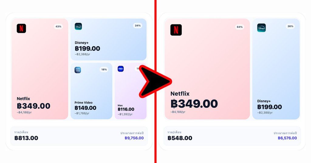 หรือเอาจะใช้สูตรมีแอปหลัก 1 ตัว และ สลับแอปรองแทน เช่น ผมเลือก Netflix เป็นแอปหลัก และแอปรองคือ Disney+, HBO, Prime Video ที่จะสลับไปแล้วแต่ว่าคอนเทนต์ช่วงไหนของแต่ละแอปน่าดู เท่านี้ก็ไม่ต้องจ่ายถึง 4 แอปต่อเดือน เหลือแค่ 2 แอปเท่านั้น เห็นแบบนี้ก็ยังประหยัดไปได้เป็นหลักพันต่อปีเลย
