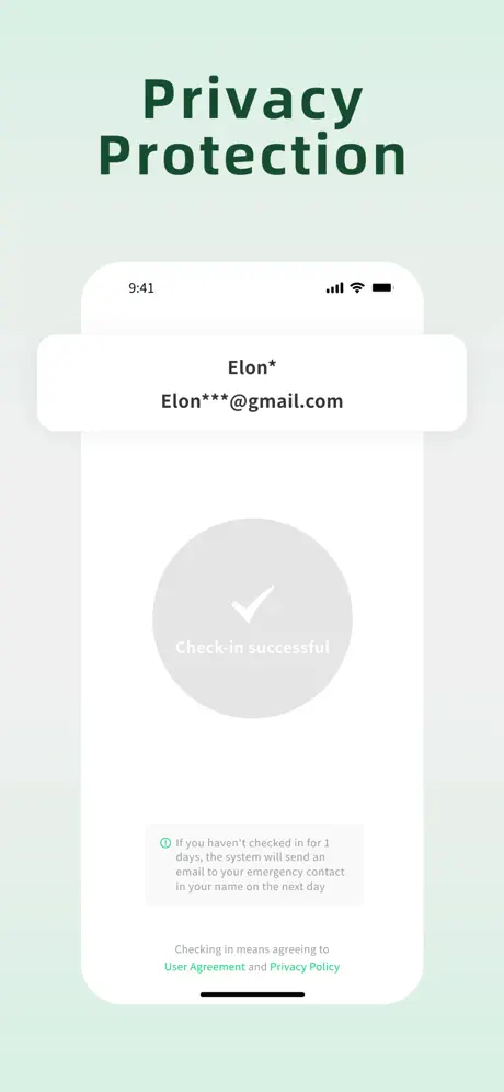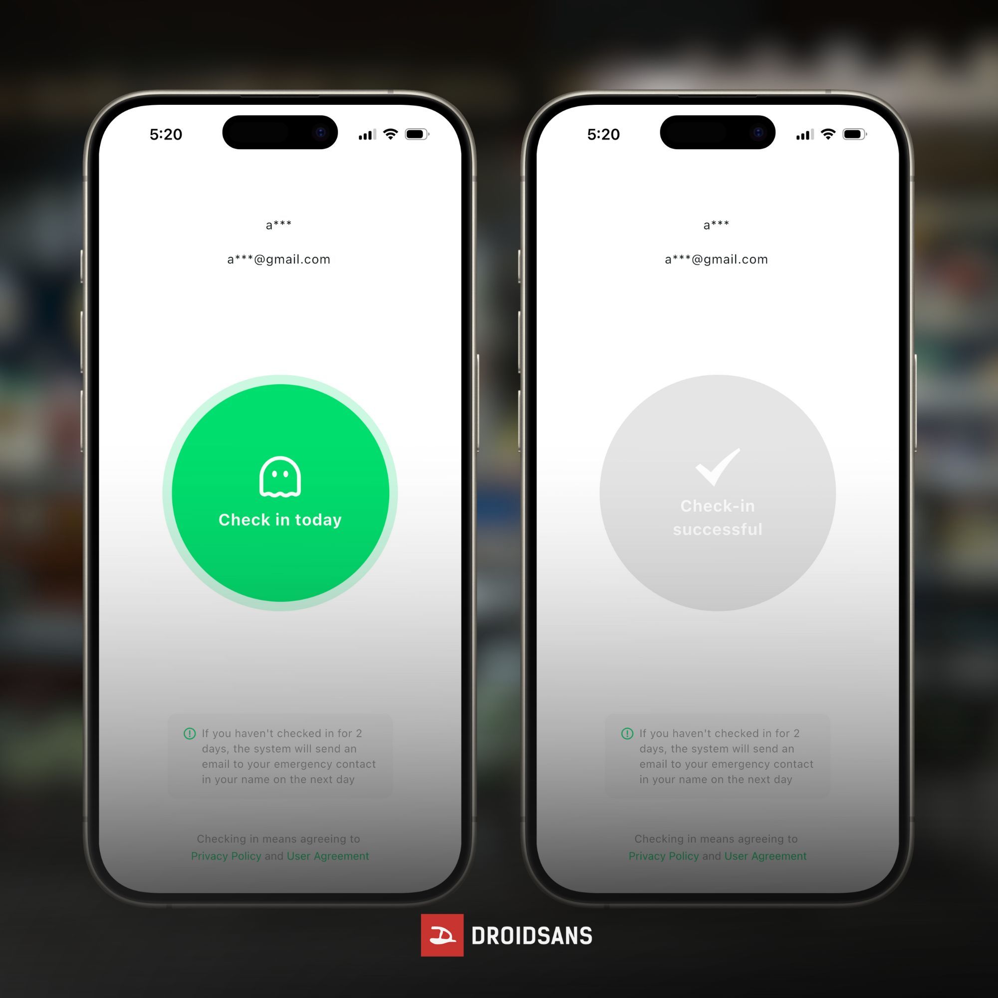 เมื่อเรากดเข้ามาในแอปฯ แล้ว จะเจอกับปุ่มสีเขียวทรงกลมขนาดใหญ่อยู่ตรงกลางหน้าจอ พร้อมกับช่องให้ระบุข้อมูลเพิ่มเติมอีกสองส่วน ได้แก่ ระบุชื่อของเรา และระบุอีเมลฉุกเฉินที่ต้องการให้ระบบส่งข้อมูลแจ้งเตือนไปหา ‘ถ้าเราไม่กดเช็คอินแอปฯ เกิน 2 วัน’