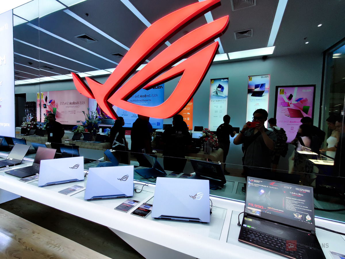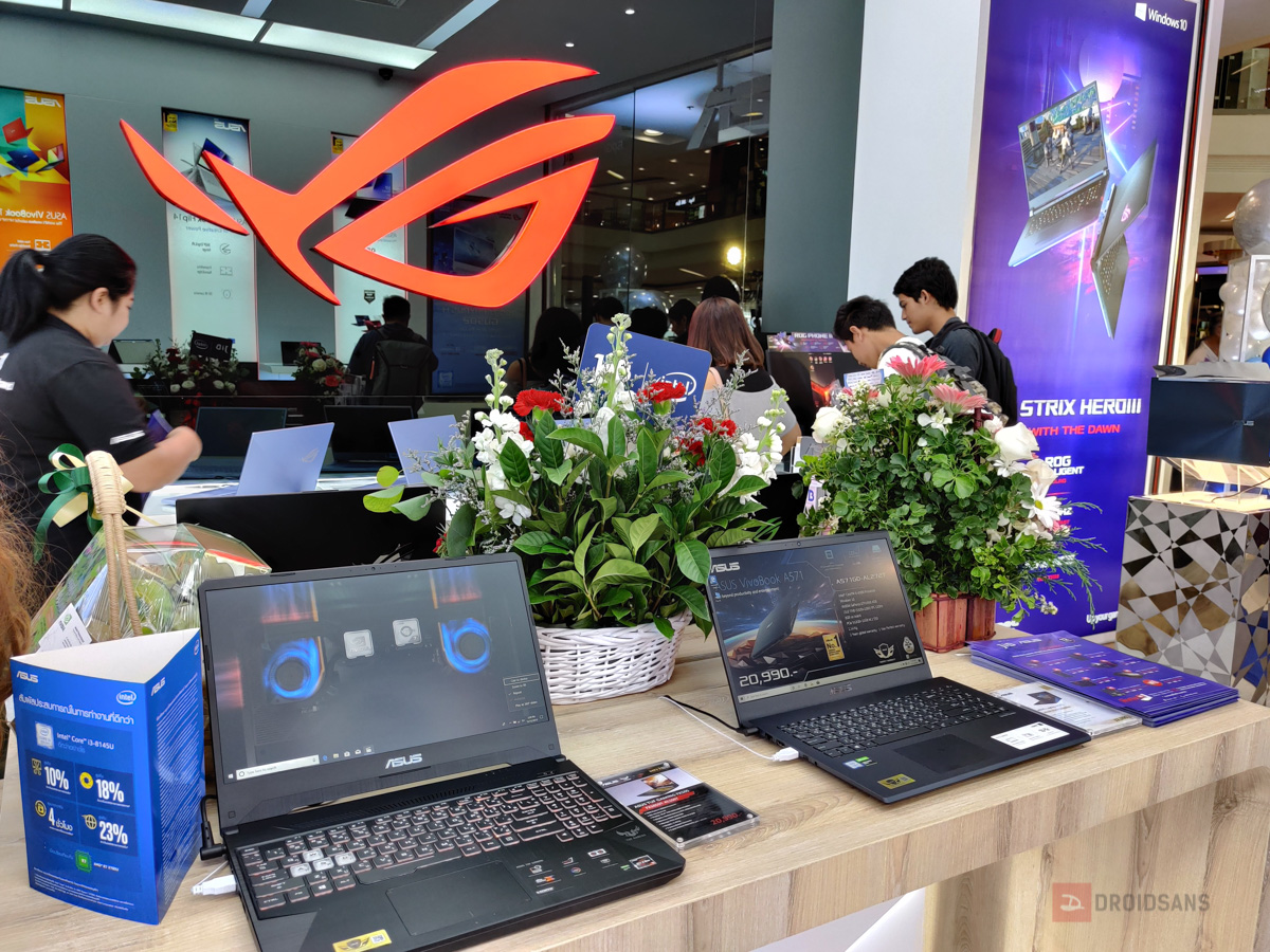 เริ่มกันที่ด้านหน้าร้านเดินเข้ามาโซนทางขวามือก็จะเป็นโน้ตบุ๊คตระกูลเกมมิ่งทั้งหลายเรียกได้ว่ามีเท่าไรขนมาหมดทุกซีรีส์ ไม่ว่าจะเป็น ROG, ROG Strix, ROG Zephyrus หรือ Tuf Gaming โน้ตบุ๊คเล่นเกมราคาประหยัดก็มีวางจำหน่ายกันครบ ส่วนตัวทีมงานชอบ ROG Zephyrus สีน้ำเงินเทาตัวใหม่มาก สวยจับใจจริงๆ อยากได้มารีวิวเลย