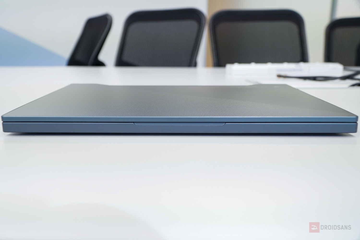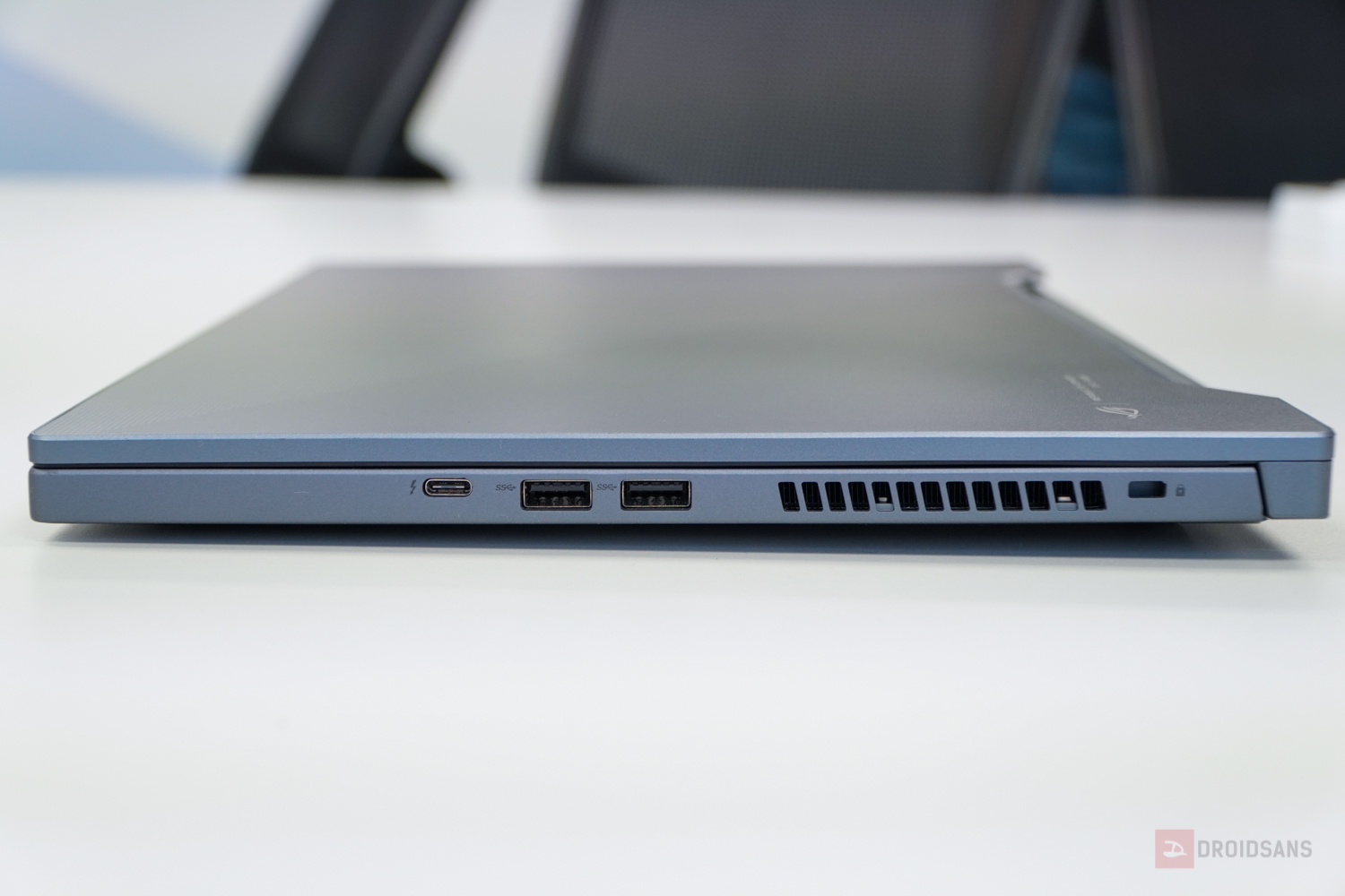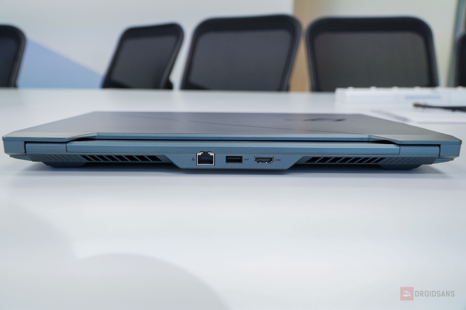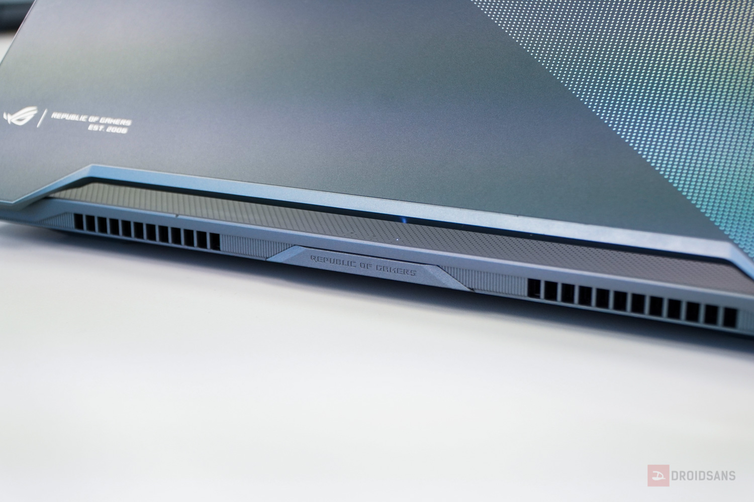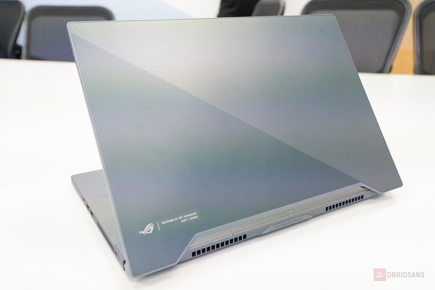 ถัดมาดู Zephyrus ซีรีส์ M กันบ้างกับเจ้า M15 ที่คราวนี้เปลี่ยนดีไซน์ใหม่หมด จากฝาหลังเป็นรูปโลโก้ ROG ใหญ่ๆ ถูกย่อให้เหลือเป็นกรอบสี่เหลี่ยมเล็กๆ ที่มุมล่างซ้ายแทน ส่วนลายฝาหลังก็ทำลวดลายใหม่เป็น dot Matrix สะท้อนแสงเป็นสีรุ้งๆ สวยงาม บอดี้ทำจากแมกนีเซียมอัลลอย ดูเป็นได้ทั้งโน้ตบุ๊คทำงานและเล่นเกมในเวลาเดียวกัน และที่สำคัญคือตัวเครื่องมีน้ำหนักเบาเพียง 1.9 กิโลกรัมเท่านั้น