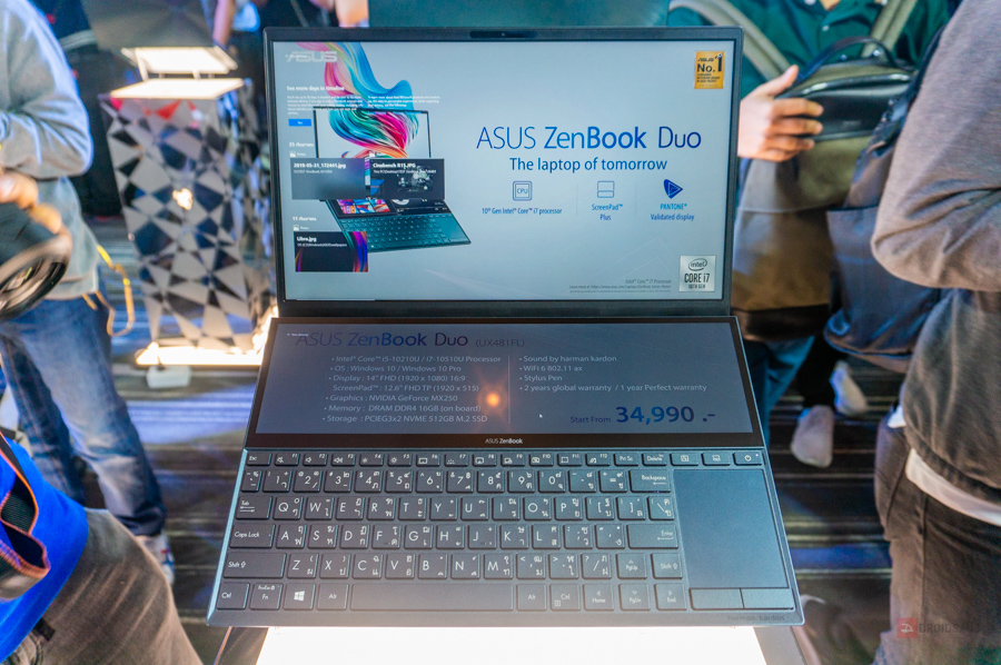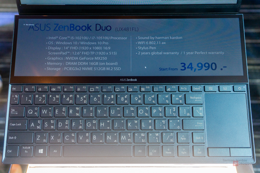 สำหรับจุดเด่นของ ZenBook Duo ก็จะคล้ายๆ กับตัวรุ่นพี่ด้านบนที่มี 2 หน้าจอสัมผัส โดยสเปคจะเป็นรองกว่านิดหน่อย แต่ก็จะได้ในเรื่องของน้ำหนักที่เบากว่าและระยะใช้งานแบตเตอรี่ที่นานกว่าด้วย โดยเจ้าตัวนี้จะมาพร้อมกับซีพียู Intel Gen 10 รหัส U เป็นรุ่นแรกของค่ายอีกด้วย แต่แอบมีข้อสังเกตนิดหน่อยตรงที่ยังใช้ Ram เป็น LPDDR3 อยู่ (ในสติ๊กเกอร์เขียนผิดเป็น DDR4)