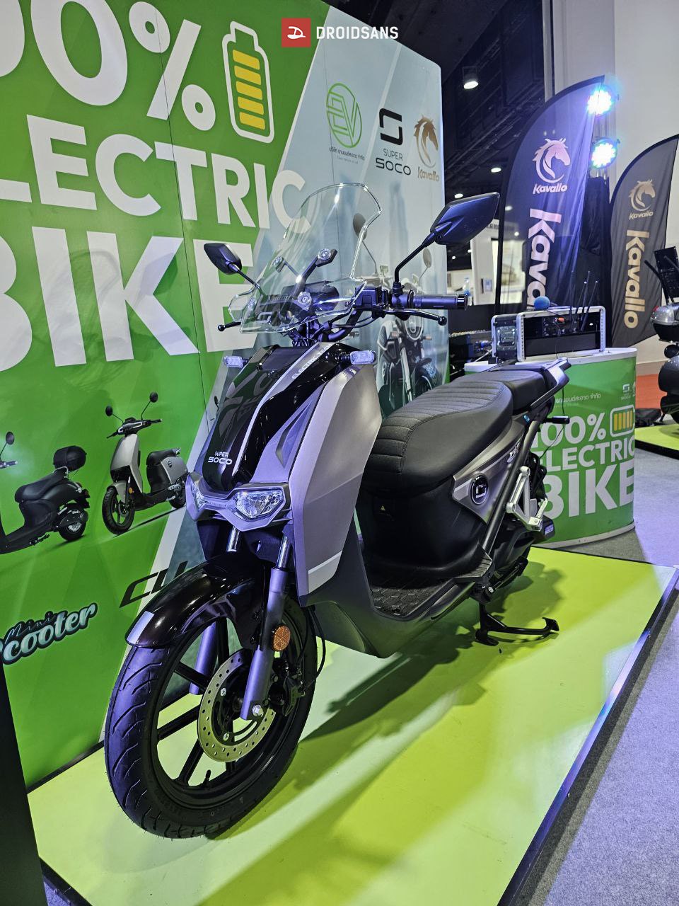 ตัวต่อมาเป็น รถจักรยานยนต์ไฟฟ้าภายใต้แบรนด์ SUPER SOCO มีกลิ่นอายของรถ Neo-Retro ที่ดูแบบผ่าน ๆ แล้วจะทำให้เรานึกถึง Husqvarna Svartpilen ที่มาพร้อมกับไฟหน้าแบบ LED ทรงกลมโต ใช้กำลังไฟฟ้าของมอเตอร์ 3900 วัตต์ แบตเตอรี่ Lithium ความจุ 72V/45Ah ชาร์จไฟเต็ม 4-9 ชั่วโมง ความเร็วสูงสุด 95Km/h ระยะทางวิ่งได้สูงสุด 92Km