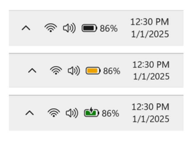 อีกหนึ่งการปรับปรุงที่ถือว่าทำได้ดีและแก้ปัญหาเดิมได้ตรงจุด คือการออกแบบไอคอนแบตเตอรี่แบบใหม่ใน Windows 11 Microsoft ปรับให้ตัวบ่งชี้สถานะแบตเตอรี่เข้าใจได้ง่ายขึ้นด้วยการใช้สีแยกตามสถานะการทำงานอย่างชัดเจน สีเขียวแสดงถึงการชาร์จไฟ สีเหลืองใช้บอกโหมดประหยัดพลังงาน สีแดงแจ้งเตือนว่าแบตเตอรี่ใกล้หมด และสีดำหมายถึงการใช้งานแบตเตอรี่ในสถานะปกติ โดยยังคงใช้สัญลักษณ์ประกอบควบคู่กับสีเหมือนเดิม เพื่อให้ผู้ใช้สามารถแยกแยะสถานะได้ในทันที