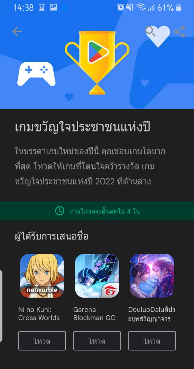 ใกล้สิ้นปีเข้าไปทุกทีแล้ว ในช่วงโค้งสุดท้ายของปี 2022 ทุก ๆ ปีทาง Google Play จะเปิดให้โหวตนำเสนอเกมแห่งปีเพื้อเฟ้นหาเกมขวัญใจประชาชน หรือสุดยอดเกมที่น่าเล่นที่สุดบน Play Store ภายใต้แคมเปญ Google Play’s Best of 2022 โดยสามารถร่วมโหวตได้แล้วตั้งแต่วันนี้จนถึงวันที่ 14 พฤศจิกายน 2022 เอาเป็นว่าเรามาดูกันดีกว่าว่าจะมีเกมไหนน่าสนใจบ้าง หรือจะมีเกมในดวงใจของเพื่อน ๆ ติดโพลกันบ้างมั้ย