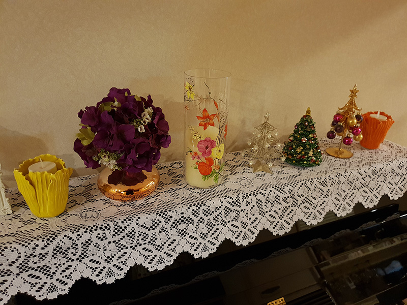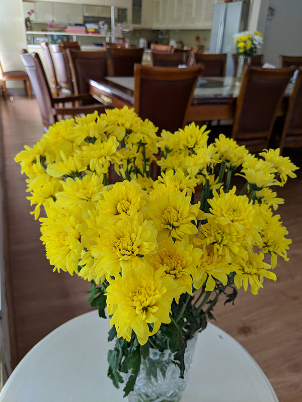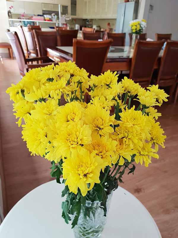 ดอกไม้สีเหลือง สภาพแสงในบ้าน มีแสงมาจากหน้าต่าง ดูสีและการละลายฉากหลัง
